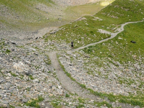Umso größer ist die Überraschung, als rechts unterhalb die Bergstation eines Sessellifts zu sehen ist und es links um eine Biegung herum direkt zum Jochpass geht. Ein kurzes Verschnaufen, ein Blick auf die Uhr und die feste Zuversicht ist da, dass ich es packen werde. Es sind nämlich nur noch drei Kilometer, die mich vom Ziel trennen. Am Jochpass befreie ich mich nach 13:15h vom Joch des Zeitdiktats.