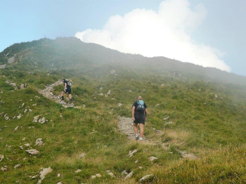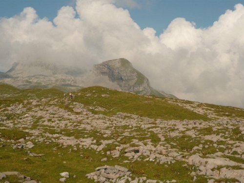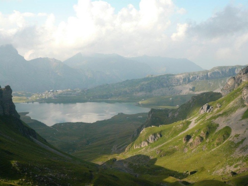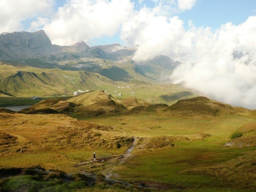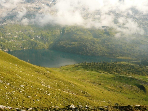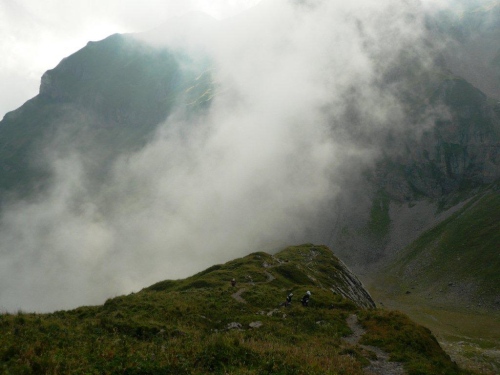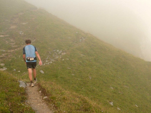 Den Höhenwanderweg, welchem wir über die teilweise bizarr geschliffenen Steinformationen folgen, würde ich für Leute mit Grundkenntnissen im Ultra-Berglauf als Panoramatrail für Fortgeschrittene bezeichnen. Hoch über dem Engstlensee geht es weiter, zuerst mit ganz langen Schatten vor mir, später im Nebel. Für mich, der ich keinen Meter der Strecke kenne (schließlich bin ich hier als Sechsjähriger das letzte Mal gewandert) ist überhaupt nicht mehr abzuschätzen, wie weit es bis zum Jochpass wirklich noch ist. Jeder Kilometer kommt mir wie eine Meile vor. Ich will jetzt nicht gleich übertreiben und sagen wie eine badische Meile – aber mindestens wie eine nautische, die doch noch etwas länger ist als die aus dem amerikanischen Straßenverkehr bekannte Landmeile.