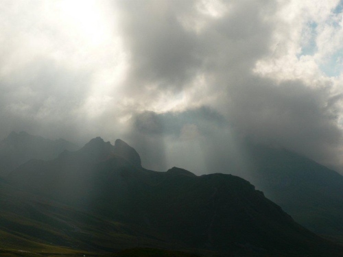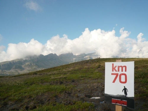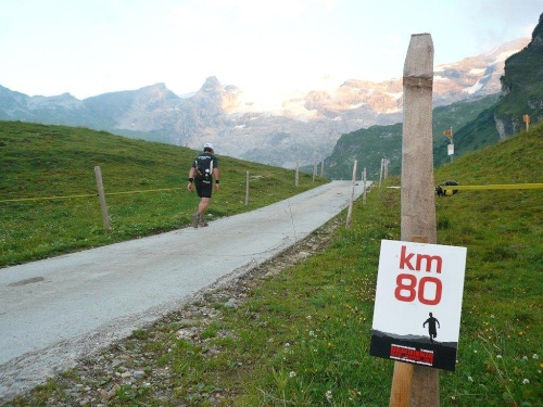 Die letzten sechzehn Kilometer beginnen mit einer Passage bergab, bevor ein kurzer heftiger Gegenanstieg zum Kulminationspunkt des Mountainman führt, dem Balmeregghorn. Mit dem schnell wechselnden Gewölk, dem Gegenlicht auf der einen, mit Schnee bedeckten Gipfeln auf der anderen Seite, wechselt die Stimmung sehr schnell. Also, nicht meine. Die bleibt ziemlich stabil. Am rechten Fuß hat sich zwar eine schmerzende Blase an der Sohle gebildet und die Uhr läuft unerbittlich weiter, trotzdem bin ich zuversichtlich, dass ich – Unvorhergesehenes ausgeschlossen – innerhalb des Zeitlimits den Mountainman schaffen werde. Ein Wanderwegweiser, auf welchem bis zum Jochpass 3:30h Marschzeit angegeben sind, beunruhigt mich dann aber doch nochmals für einen Moment. Auf dem kurzen Straßenstück vor der nächsten Verpflegung auf der Tannalp ist der Schatten vor mir im warmen Abendlicht dann auch tatsächlich schon ziemlich lang.
