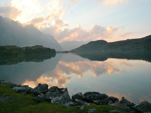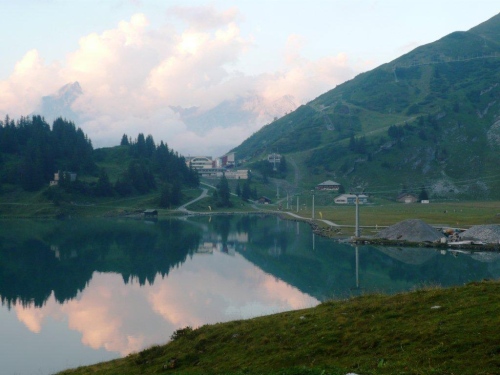 Der Abstieg zum Trübsee hat es allerdings in sich. Auf dem groben Schotter fährt mir das Gefälle mehr in die Oberschenkel als alles Vorhergegangene. Die Unterstützer anderer Läufer lenken mich mit ihrem Beifall zwar etwas ab, doch ich bin froh, dass ich weiß, dass nach diesem Gefälle das Ziel in Sichtweite sein wird. Kurz nach dem Einbiegen auf die befestigte Straße steht das lang ersehnte Kilometerschild. Garniert ist es mit einem wunderbaren Ausblick auf den Titlis, welcher in den letzten Strahlen der Abendsonne leuchtet. Immerhin gibt es auch für langsamere Läufer ein paar Exklusivitäten. Die nächste ist nämlich die Stimmung über dem Trübsee zu meiner Linken, welche mir zu einem Bild verhilft, das sich in meiner umfangreichen Laufbericht-Galerie gerade zu meinen Favoriten katapultiert. Ich nehme es als Belohnung für das laufende Ausharren vom Mo(o)rgen bis zum Abend.