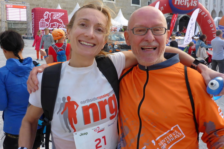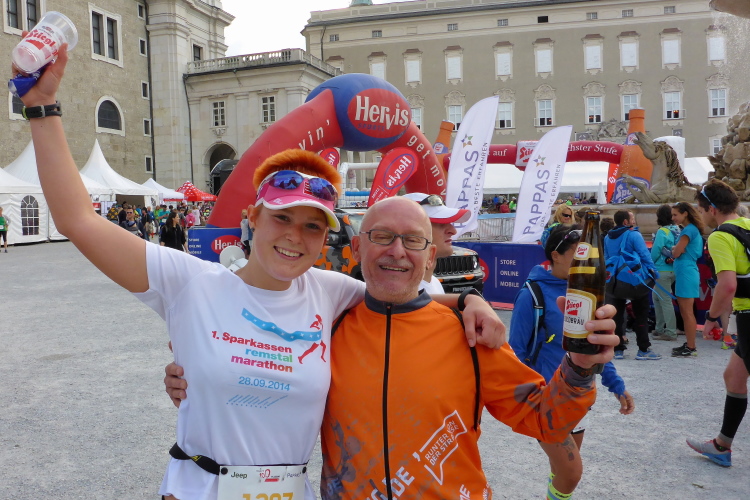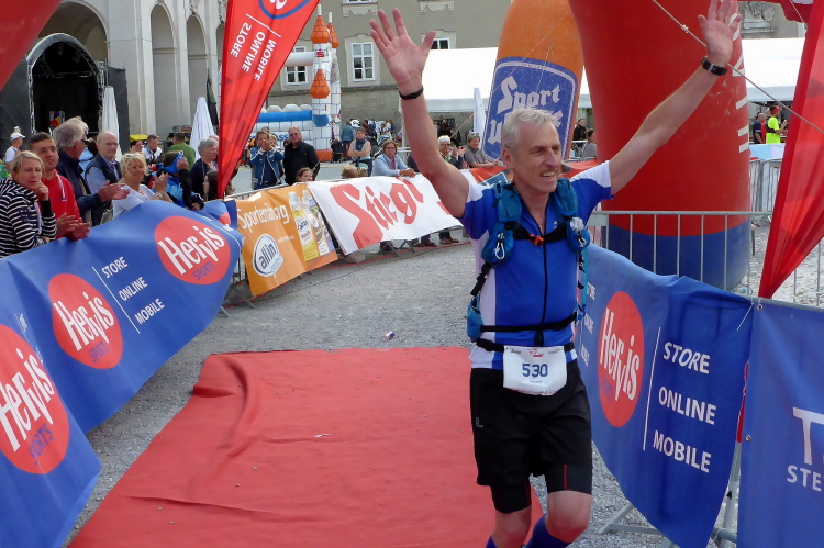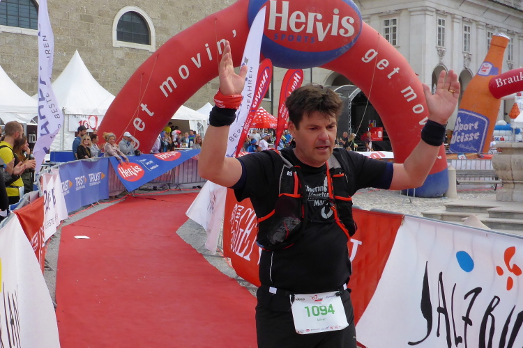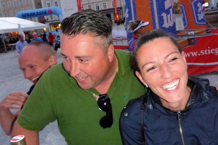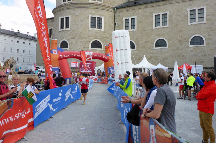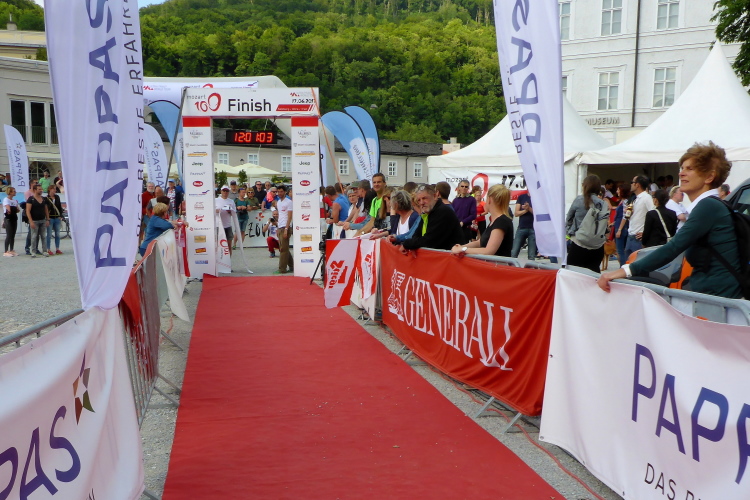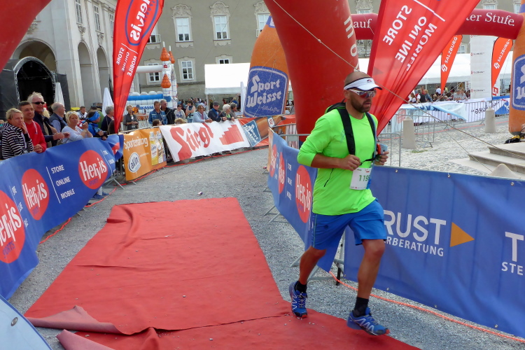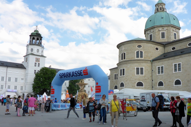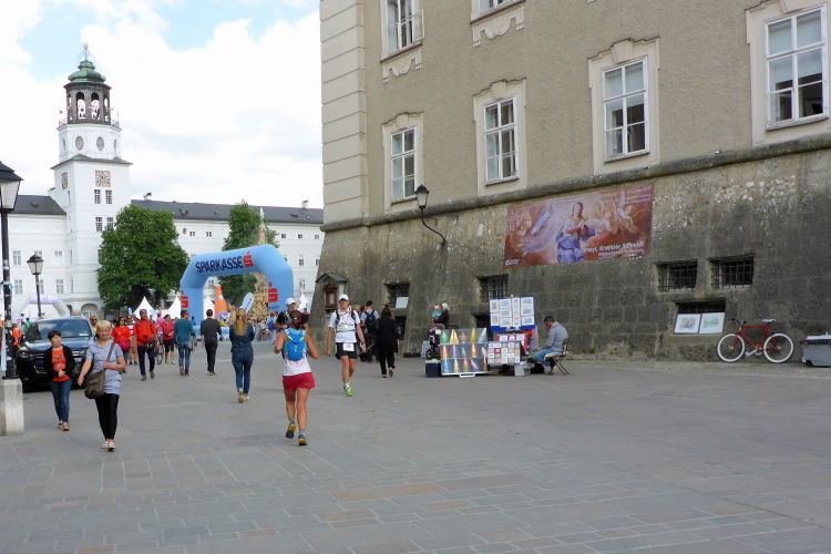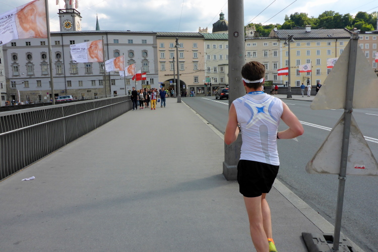Wir laufen über die Staatsbrücke. Ein Ordner weist mich in die Unterführung, unter die Uferstrasse ein. Die Sicherungsmaßnahmen sind streng. Ich danke, denn ich bin nicht mehr konzentriert. In der Fußgängerzone wird es eng. Rechts ist Mozarts Geburtshaus, jetzt großes Museum. Ich komme nicht durch die Touris durch. Ein Einheimischer brüllt mir den Weg frei, verschafft mir Respekt bei Chinesen und Koreanern. Dann laufe ich an den fettbestückten Verkaufsständen vorbei, Ziel: blendendweißer Dom, wo schon die Abschlussparty tobt. Ich bin zwar nur 62 gelaufen, aber mir wird es kalt am Rücken. Endlich wieder!