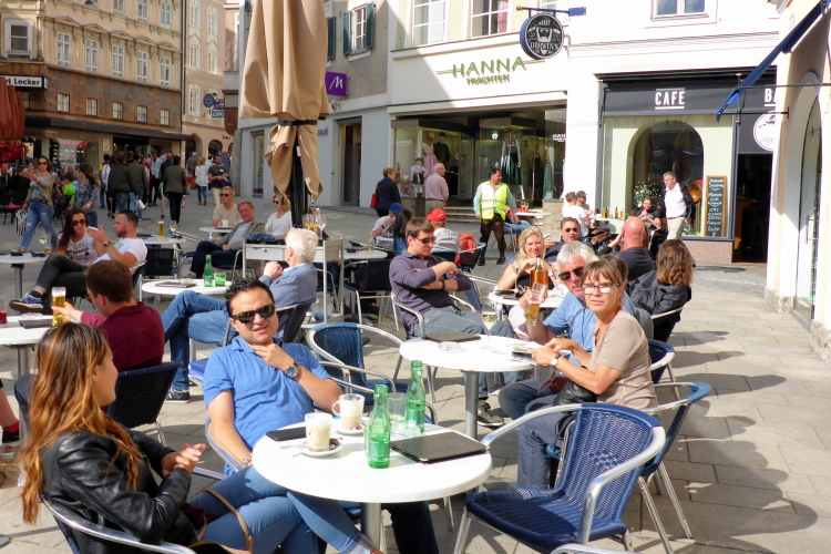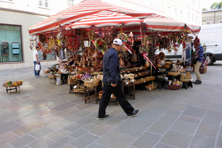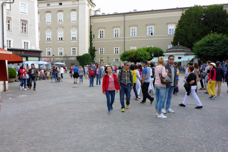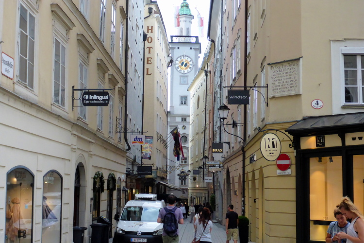 Ich komme jetzt in die Fußgängerzone, wo mich die Leute freudig begrüßen. Es sind gutaussehende Leute. Salzburg ist nicht Deutschland. Ich nehme die Kurve über die Brücke, geradeaus wäre jetzt das Wohnhaus von Mozart. Makartplatz 8 ist die Adresse.