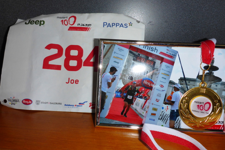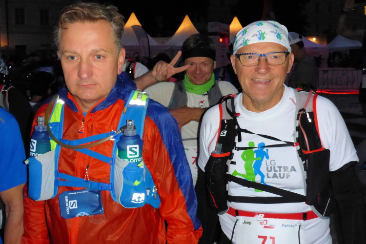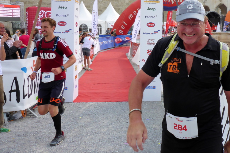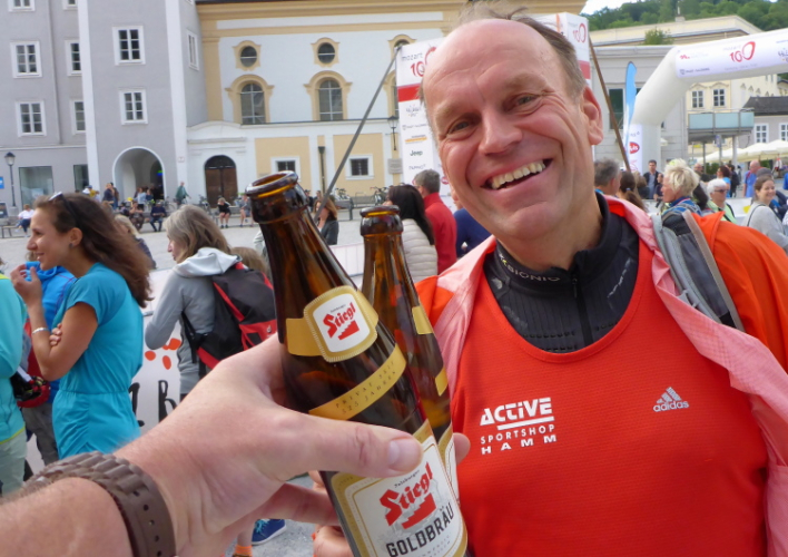 Genau nach 100 Kilometern (für mich 57 km) erreichen wir die ersten Häuser von Salzburg und steigen hinauf zum Kapuzinerberg. Johan aus Plano (Texas) ist am Fluchen, Plano hat seinen Namen bestimmt nicht wegen der Berge. Kevin kommt aus Canada, arbeitet für Tropicana, einer Tochter von Pepsi, verdurstet sichtlich, hält sich krampfhaft am Holzgeländer fest und holt sich nen Schliffer in die Hand. Yushiro aus Japan verbeugt sich vor mir, weil ich ja die 62 Kilometer laufe, und er nur die 42.