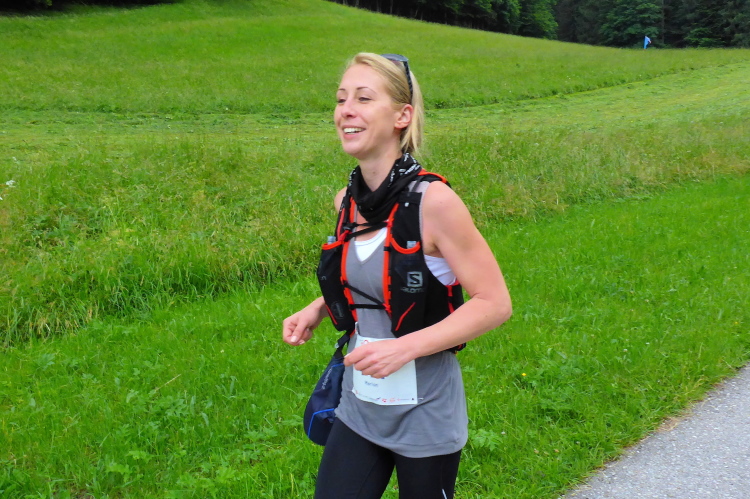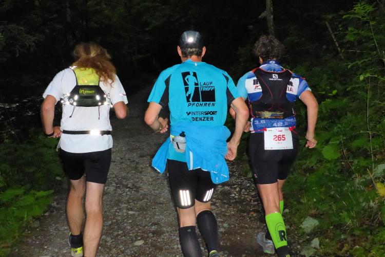 Ich habe zwar keine Flügel, aber wieder den Anschluss an die 105 Kilometer Kameraden gefunden, die ich an der nächsten Steigung wunderbar abhänge. Dann geht es hinab zum glasklaren See. Ein wenig kommt nun die Sonne hervor und durchleuchtet das lockende Wasser. Traumhaft! Leicht geht der Weg in einem ständigen Auf-Und-Ab rechts entlang, um den See. Eigentlich war die Laufstrecke bis jetzt nicht sehr fordernd, doch bei der nächsten Labestelle bei Kilometer 31 bin ich nur 30 Minuten unter Cut-Off und mir graust es vor dem nun beginnenden hochalpinen Teil dieses Laufes. Ich glaube, es ist Christina, die ich frage, ob ich auf die 62 Kilometerstrecke (2211 hm) wechseln kann. Offiziell wird das nicht angeboten, aber sie sagt: „ Das haben schon 20 Läufer vor dir so entschieden.“