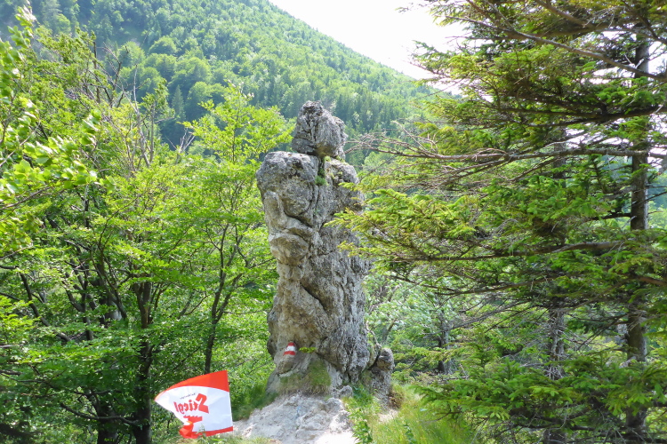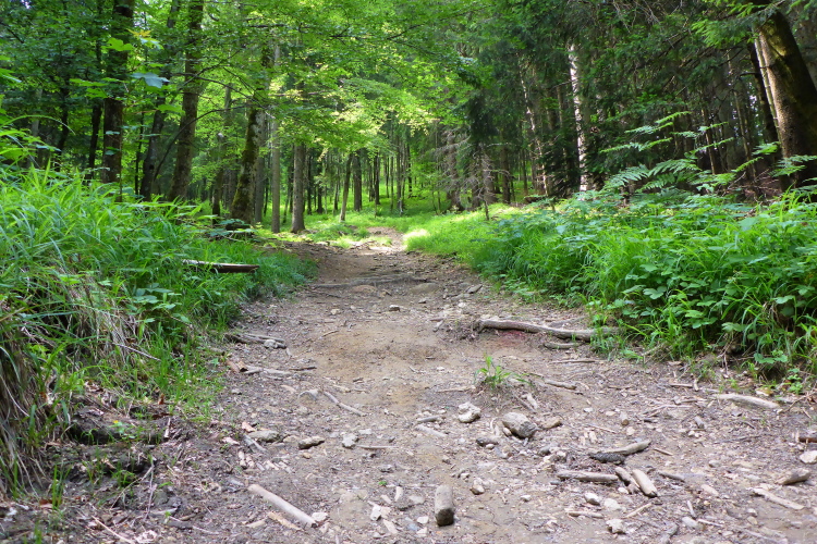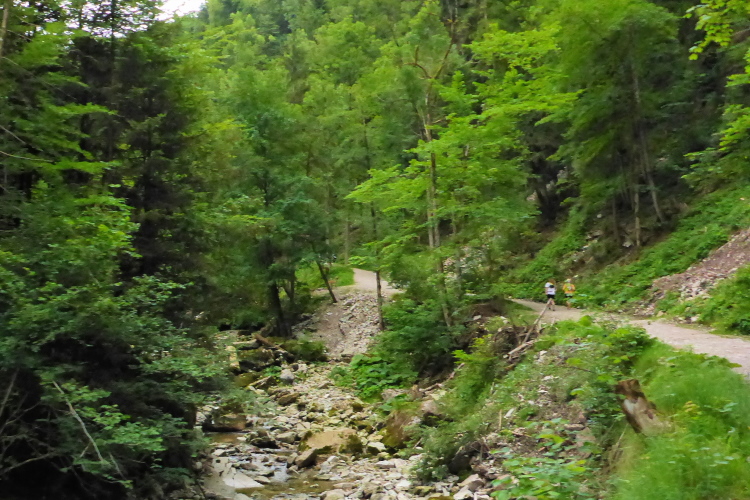 Die Pechauer Scharte ist ein Gebirgspass (770 m) zwischen den unerschlossenen Bergen Gurlspitze (1158m) und Pitrachspitze (982m). Von hier geht es zügig abwärts, ich laufe, laufe, und….verlaufe! Ich bin mir so sicher, dass ich mich verlaufen habe, dass ich mitten auf den Weg pinkel, dann drehe ich um und dackel 20 Minuten wieder hinauf. Oben angekommen registriere ich, dass ich doch richtig war. Also wieder runter.