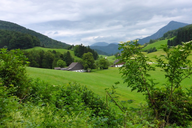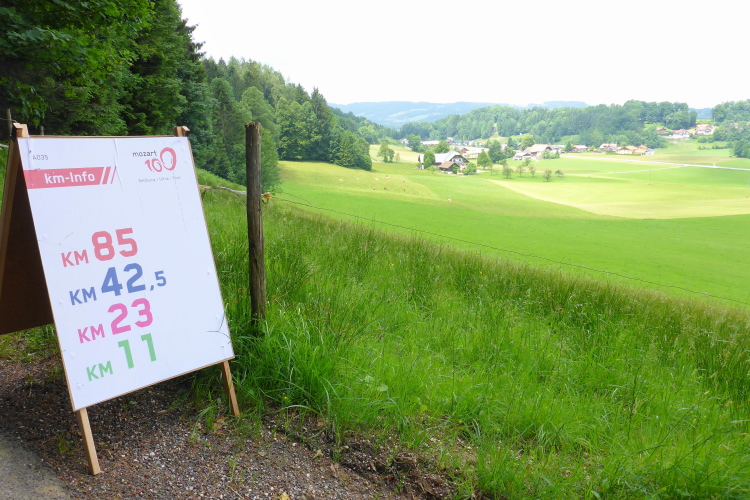 Die nächste Labestation erwartet mich dann theoretisch bei km 66 am Fuße des Zwölferhorns in einer Höhe von 1050 Metern, wenn nicht, wie ich erwarte, die Strecke wieder verschärft wird. Seit 1563 ist die Familie Schoßleitner im Besitz der Sausteigalm. Vier Bauern teilen sich die Bewirtschaftung der Alm. Es werden bedrohte Nutztierrassen gezüchtet. Bei km 68 würde ich dann den Kühleitenpass queren, der die Grenze zwischen dem Wolfgangsee und dem Fuschlsee bildet. Bei km 74 hätte ich wieder die Labestation erreicht, bei der ich jetzt auf die 62 Kilometerstrecke abgebogen bin. 19:30 Uhr ist dann hier Cut-Off.
