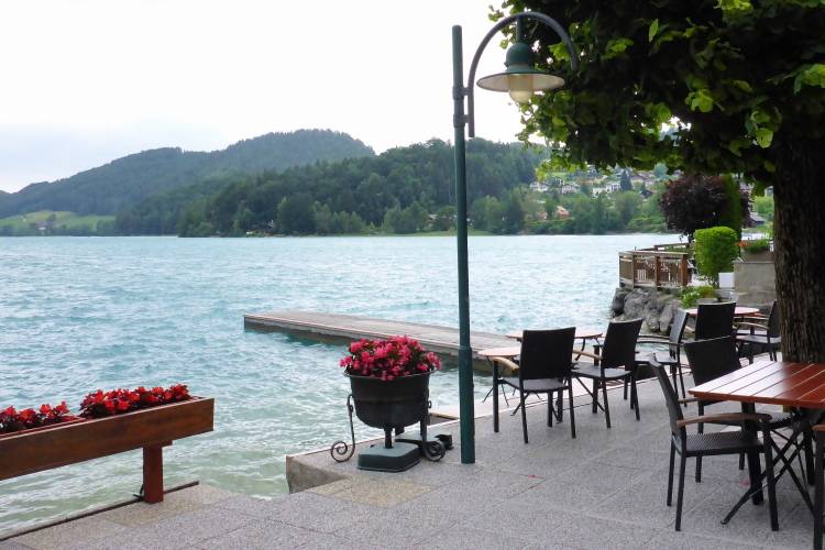 Bei km 43 erreiche ich dann die beeindruckenden Steinklüfte des Plombergstein (830 m). Die Berge, die den romantischen Wolfgangsee einrahmen, sind spitz und steil. Dann werde ich St Gilgen sehen, den ehemaligen, inoffiziellen Sitz von Helmut Kohl. 1984 kam Margaret Thatcher zu Besuch, sie war „not amused“, als der 1,91 Meter große Kanzler sich nach einer Stunde verabschiedete, um zwei Tortenstückchen in der Konditorei Dallmann zu vertilgen. Vielleicht war dies der Grund ihres Widerstandes gegen die Wiedervereinigung, denn sie sah Helmut zufällig durch das Fenster der Konditorei. Dabei hatte er ihr von einem „wichtigen Termin“ erzählt. Kohl, der Tortenkanzler!