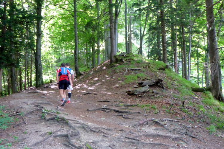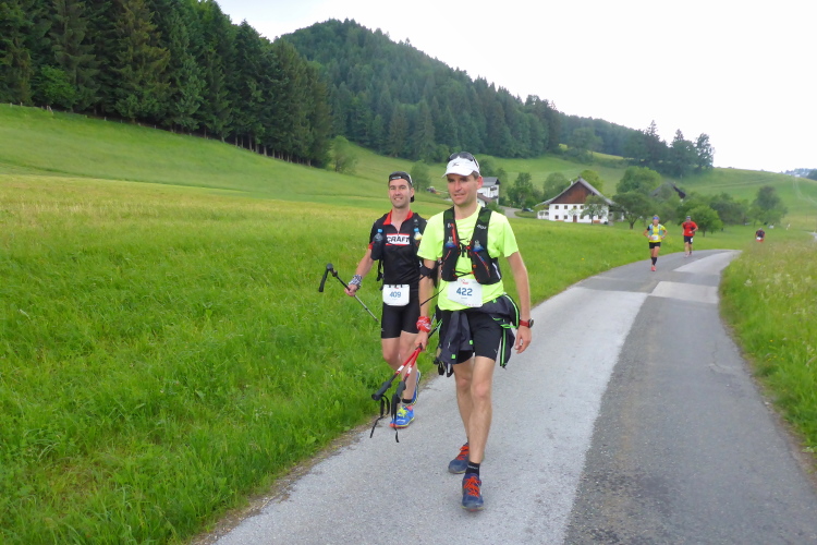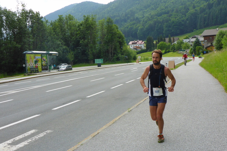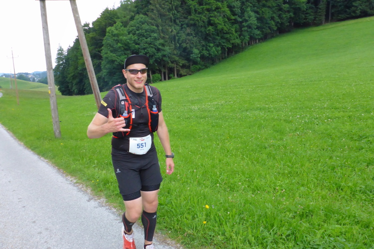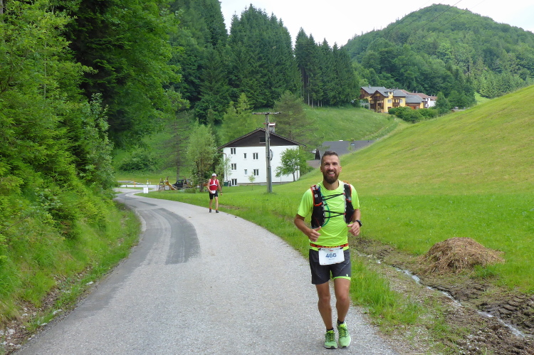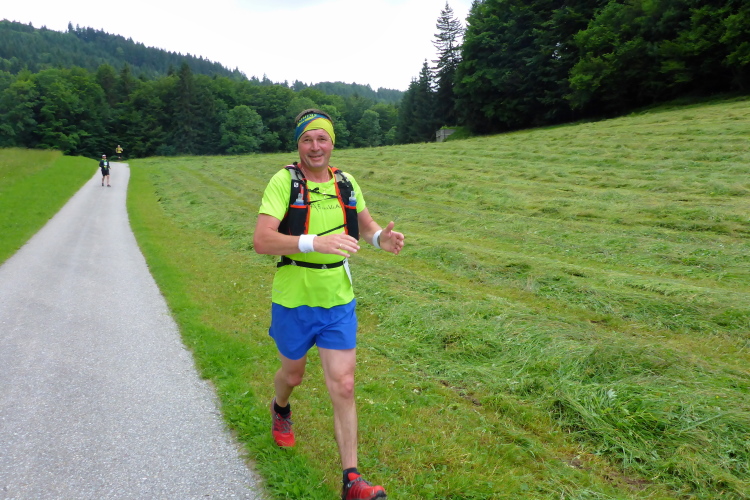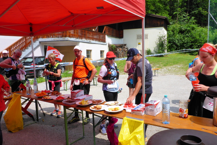Das Schloss Fuschl wurde als Jagdschloss im 15. Jahrhundert erbaut, dient nun als Luxushotel. In den 50er Jahren wurden hier die Sissi-Filme gedreht. Hinter dem Schloss beginnt der 10 Kilometer lange Aufstieg bis zu unserem morgendlichen Kilometer 17 Punkt, den Plötz-Wasserfällen. Mir kommen nun die eigentlichen 62-Kilometerläufer entgegen, die nach mir, dem ehemaligen 105 Kilometerläufer gestartet sind. Zurück bei der Verpflegungsstation Hof bekomme ich wortlos ein eiskaltes Stiegl in die Hand gedrückt. Hier ist der Wendepunkt der Marathonläufer (1647 hm), hier gibt es Läufer, die sich von 62 Kilometern auf 42 runtermelden. Das geht problemlos, danke an die Orga! Die Helfer passen gut auf: „Stop-wo willst du hin?“-„Nach Hause!“ antworte ich. „Ach du hast umgemeldet“. Schande über mich!