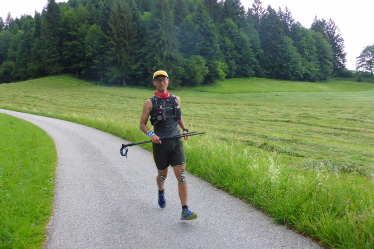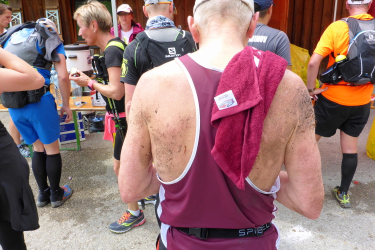 Auf dem Rücken von Dick, dem alten Mann aus Kentucky, klebt der halbe Wald. Er hat sich beim Aufstieg hingelegt, ist dann auf dem Rücken ins Tal gebrettert. Klasse Einlage für einen Flachländer. Auch Jin Ming aus Guangzou ist ein Flachländer, wirkt geknickt wegen der Höhenmeter. Eddi Goh, aus Hongkong glaube ich, hängt im Delirium am VP. Ich kann mir Zeit lassen und mit den zahlreichen Läufern aus Übersee quatschen, das gefällt mir.