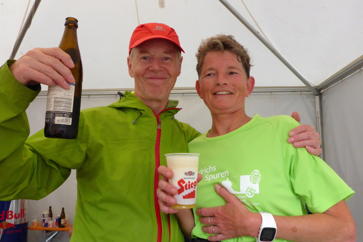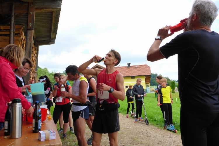 Aufstieg zum Glitzenberg (881m) und Labestation bei km 22. Ja, es gibt Bier: Die Brauerei Stiegl ist Sponsor und liefert die Fähnchen für die Markierungen, die durstig machen. Die Brauerei hat ihren Hauptsitz an der steilen Treppe (Stiegl), die hoch zur Festung Hohensalzburg in Salzburg führt. Nicht zu verwechseln mit dem Obersalzberg, wo der Adlerhost vom Zampano ist. Das ist in Berchtesgaden.