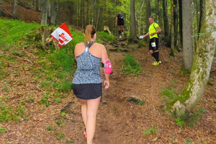 Mit zittrigen Beinen wandere ich hinterher. Doch die Sache ist noch nicht zu Ende. Es geht erneut extrem steil bergauf und wieder jäh bergab und wieder bergauf. Dann über einen Grat zu einem Felssporn. Mir schwant Übles. Doch dann führen tatsächlich noch vor dem überdimensionalen Stein Stufen hinunter. Das schaffe sogar ich. Das steile Gefälle will aber kein Ende nehmen und manchmal verliere ich den Pfad, so dass ich mich von Fahne zu Fahne orientieren muss. Eine Gruppe Wanderer kommt von unten. Sie zollen Bewunderung und warnen mich vor dem Abzweig der jetzt kommt. Da ist vorhin eine Läuferin wohl falsch abgebogen und zu früh Richtung Tal gelaufen.
