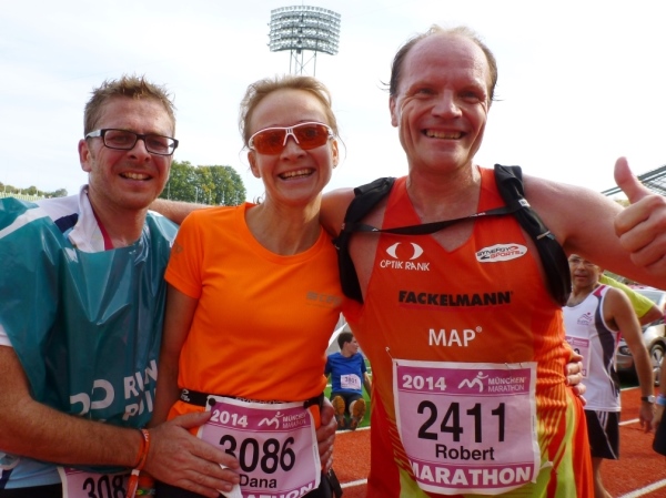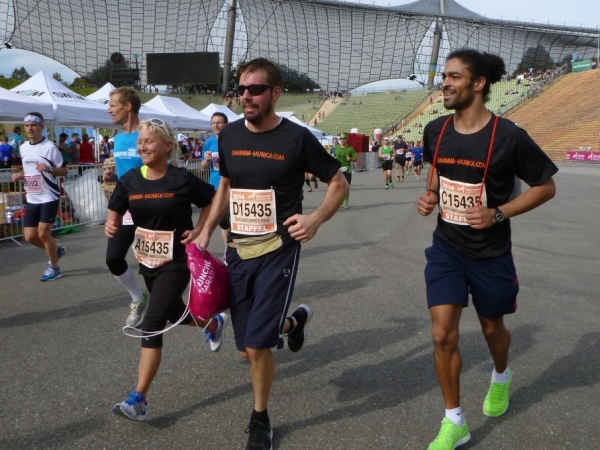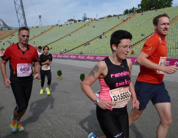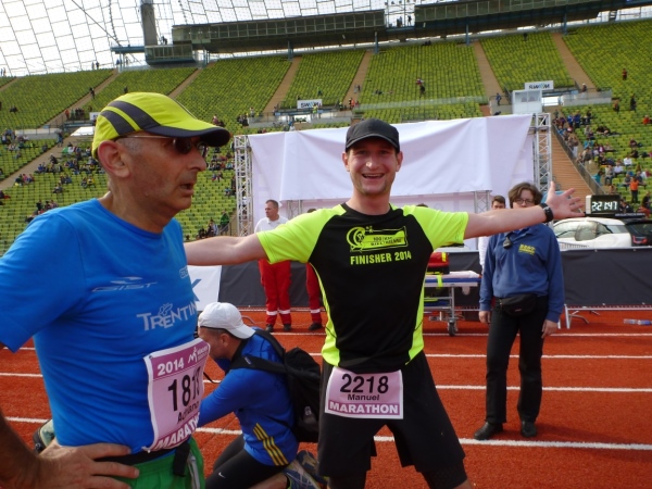 Am Ende der Finsternis grelles Sonnenlicht, Rockmusik, Applaus, affengeile Stimmung. Wir sind im Olympiastadion. Und dann der Zieldurchlauf. Gänsehaut. Geschafft. Ein schönes Rennen, der Marathon dahoam.