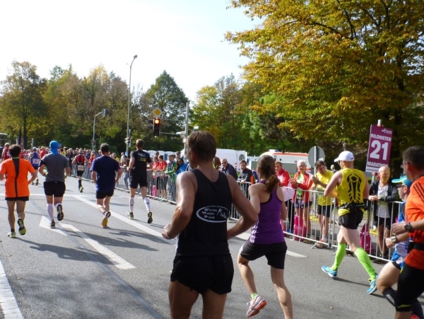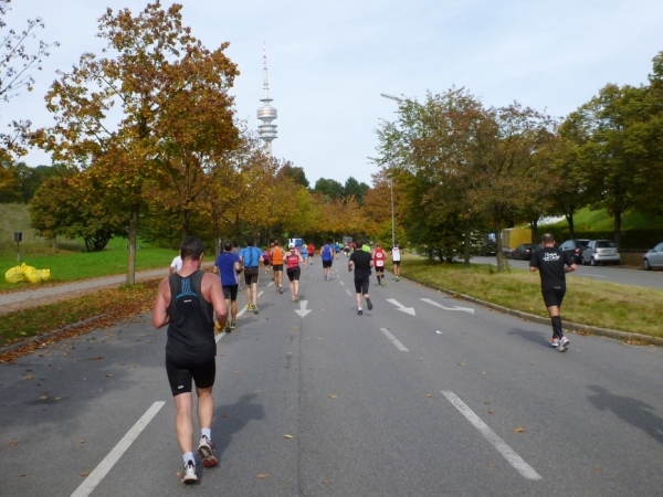 Die Stadtteile Bogenhausen und Herzogpark sind reine Wohngebiete und eher ruhig, denn der meiste Verkehr fließt auf der parallelen Effnerstraße. Immer wieder stehen Zuschauergruppen am Rand und feuern uns an. Die Sandharlander betreiben eine Tankstelle. Ein Vorschlag von mir: Wenn sie schon Werbung für den Kuchlbauer Turm in Abensberg machen, dann könnte der Kuchlbauer Bräu wenigstens die Getränke spendieren. Das Weißbier ist erstklassig.