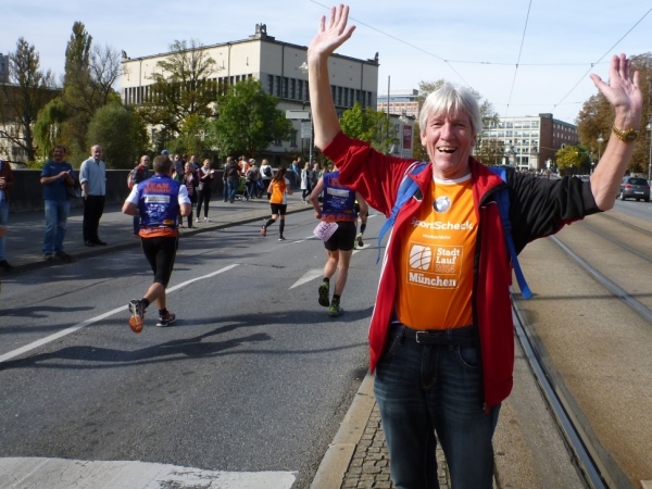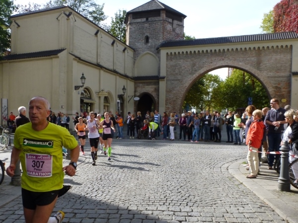 Dank des U-Bahnhofes Sendlinger Tor haben sich hier viele Zuschauer versammelt. Das Tor wurde im Rahmen der großen Stadterweiterung durch Ludwig den Bayern in den Jahren 1285 bis 1337 erbaut. Noch im 14. Jahrhundert galt es als Startort auf dem Weg nach Italien. Wir Läufer müssen uns aber umdrehen, sonst könnten wir den Teil der früheren Stadtmauer übersehen. Claus Dengler kommt aus Ingolstadt und jetzt von hinten. Er lässt mich stehen, als ich mich meiner Arbeit widme. Claus, beim nächsten Rennen in der Region werde ich mich an dir verbeißen und nicht locker lassen.