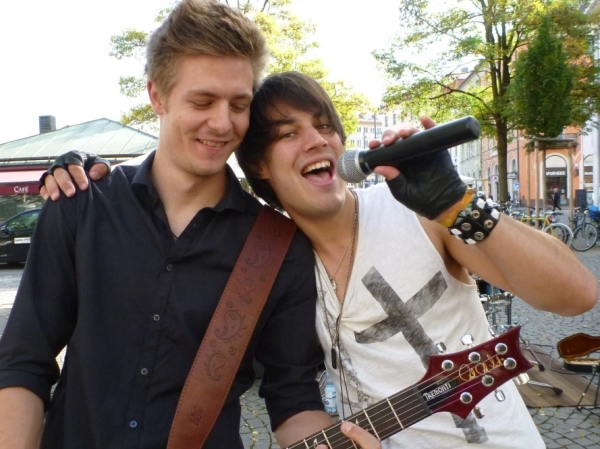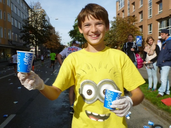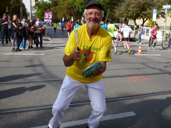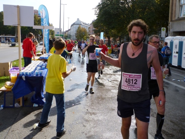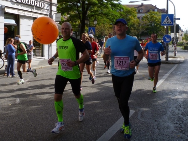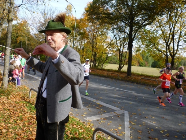 Den beginne ich am Siegestor, wo sich nun eine Sambaband postiert hat. Der Chef springt mir ein paar Meter nach und fotografiert. „The Beer is near“, ruft auf der Franz-Joseph-Straße Pete mir nach. A Seidla, a Halbe oder a Mass, unser Durscht ist gewaltig und lang dauert's nimmer. Ob es ein Erdinger, ein Franziskaner oder ein Hofbräu sein wird, ist egal. Die letzte Degustation bei Kilometer 40 lasse ich liegen, denn Wasser brauche ich jetzt nicht mehr. Stefan geht ein paar Meter mit mir mit, lässt aber dann abreißen, denn in Frankfurt soll sein Angriff auf die pB erfolgen.