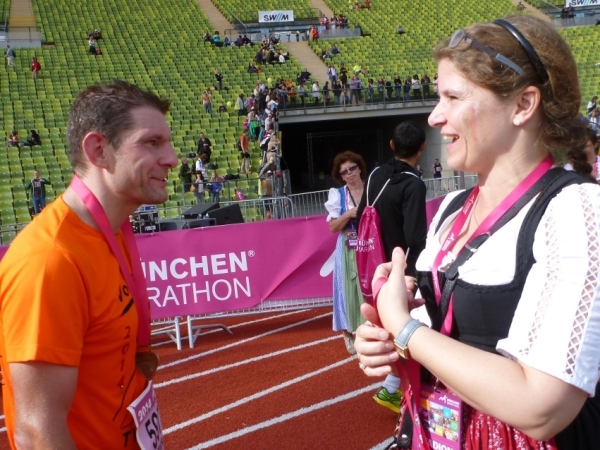Es ist schon ein gewaltiger Unterschied, ob du eine schnelle Zeit laufen, oder ob du das Ganze als Sightseeing und entsprechend gmiatlich betreiben willst. Ich fühle mich im Ziel gut und überhaupt nicht erschöpft. Viele Finisher setzen ein Lächeln auf, das sagt „ich hab's geschafft“. Oder sie widmen ihren Lauf ihren Liebsten oder ihrer Prinzessin. Robert Wimmer kommt ein paar Minuten später, er hat Dana Amarell auf 3.47 Stunden gecoacht.