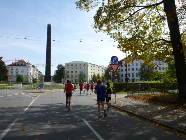 Kurz danach biegen wir auf die Runde zum Karolinenplatz ab. Hier können wir die vor und nach uns laufenden Marathonis beobachten. Königsplatz: Diesen Ort konzipierte König Ludwig I. mit seinen Architekten Leo von Klenze. Bauten des Klassizismus wie die Glyptothek, die staatliche Antikensammlung mit seinem wuchtigen Portal und die Prophyläen lassen uns immer wieder links und rechts der Strecke schauen. Am Karolinenplatz (Kilometer 34) sehen wir den Obelisken, den Leo von Klenze 1833 als Denkmal für die 30.000 in napoleonischen Russlandfeldzug gefallenen Bayern geschaffen hat.