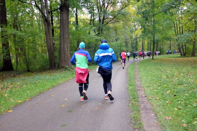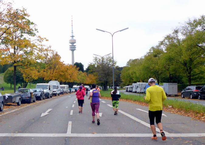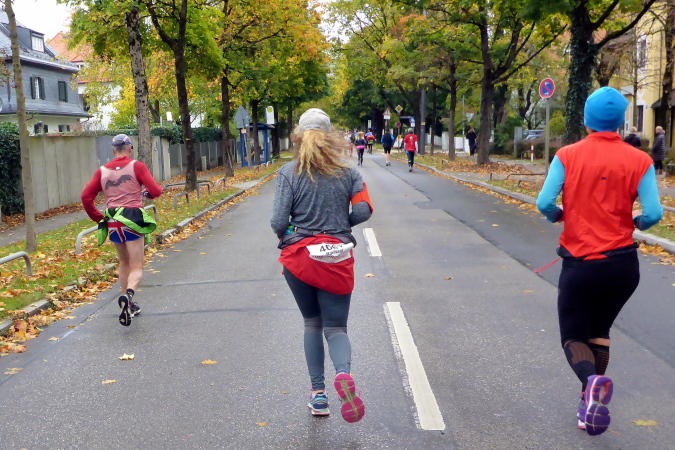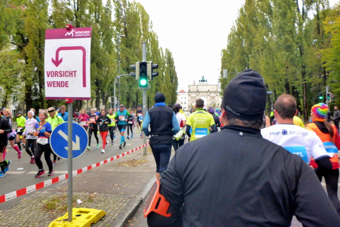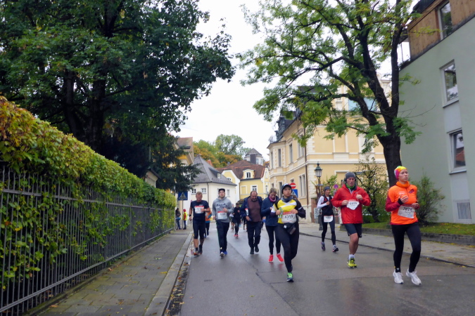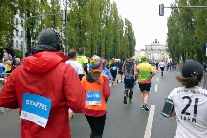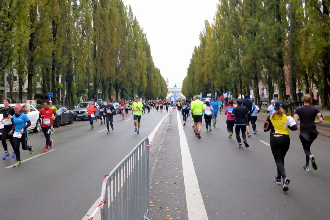 Mit zehn Minuten Verspätung auf das Spitzenfeld nehme ich meinen persönlichen Jubiläumslauf dann in Angriff. Insgesamt sind rund 5.500 Marathonis gemeldet, die noch von etwa 750 Staffeln verstärkt werden. Somit ist es gerade beim Start im dritten und vierten Startblock ziemlich voll, dennoch lässt es sich schon von Beginn an erstaunlich gut laufen. Wir verlassen nach etwa einem Kilometer den Olympiapark und finden uns auf der Ackermannstraße wieder, wo bis vor kurzem ja noch der Marathon gestartet wurde und ich befinde mich wieder auf gewohntem Terrain und erreichen schließlich die Ludwigstraße mit ihren vielen Sehenswürdigkeiten. Wir müssen uns aber gedulden, vor dem Siegestor wird nämlich gewendet und es geht wieder zurück in Richtung Schwabing. Durch ein Viertel mit noblen Villen nähern wir uns dem Englischen Garten.