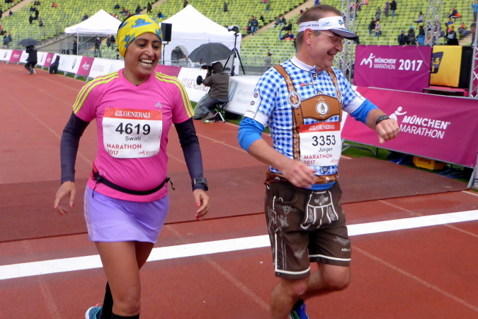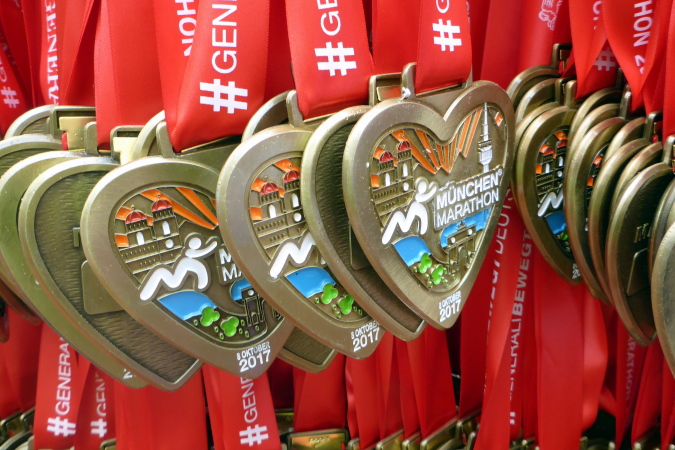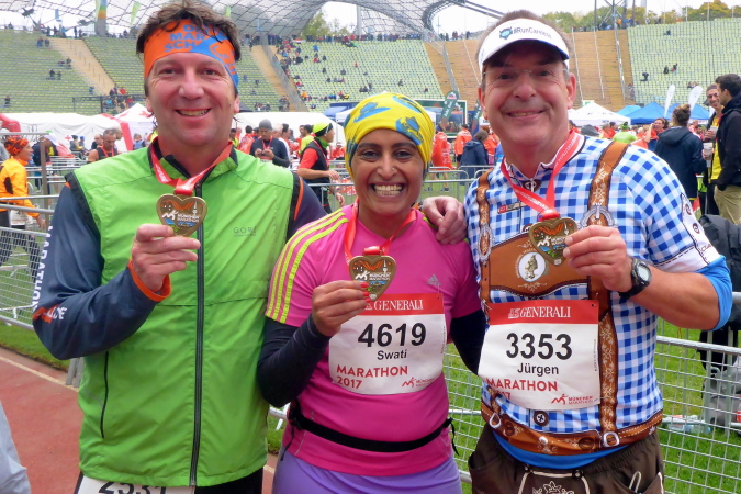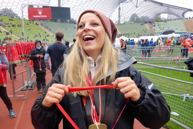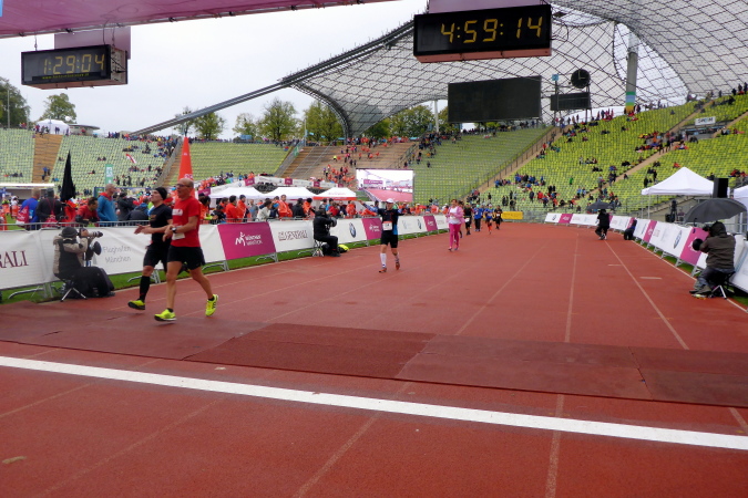 Nicht ganz doppelt so lange bin ich heute unterwegs und damit sehr zufrieden. Ich genieße den tollen Einlauf ins Olympiastadion und die letzten dreihundert Meter auf der Tartanbahn. Im Ziel kann ich schließlich meine Medaille, übrigens ein wunderschönes Stück, entgegennehmen. Ich warte noch kurz auf Jürgen und Swati, die ich auf dem letzten Kilometer noch überholen konnte und freue mich mit ihnen gemeinsam über einen tollen Jubiläumslauf.