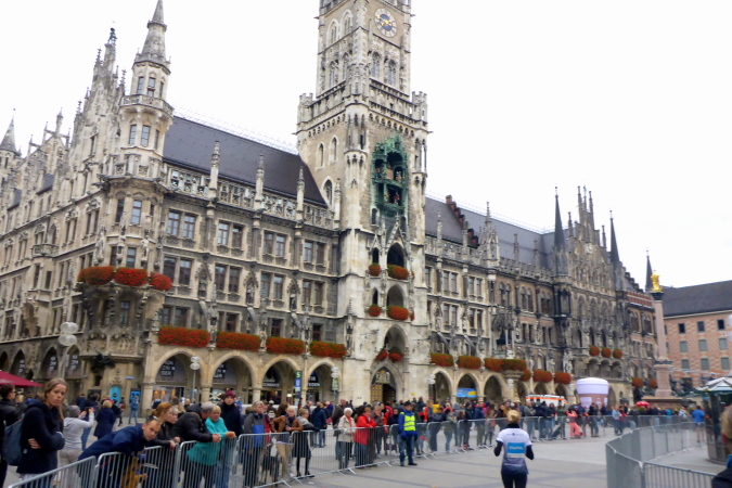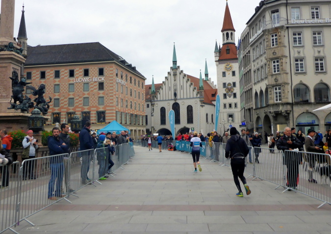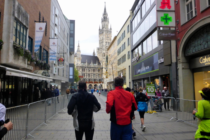 Dann kann ich auch schon die Fassade des Neuen Münchner Rathauses erkennen. Der Marienplatz liegt vor uns. Normalerweise feuern hier tausende Zuschauer die Marathonis an. Wegen des kühlen Wetters sind es heuer deutlich weniger, die sich das Spektakel nicht entgehen lassen. Der einmaligen Atmosphäre kann das jedoch nichts anhaben. Das Neue Rathaus (1867 bis 1909 erbaut) ist Sitz des Oberbürgermeisters und des Stadtrates und zudem Hauptsitz der Stadtverwaltung.