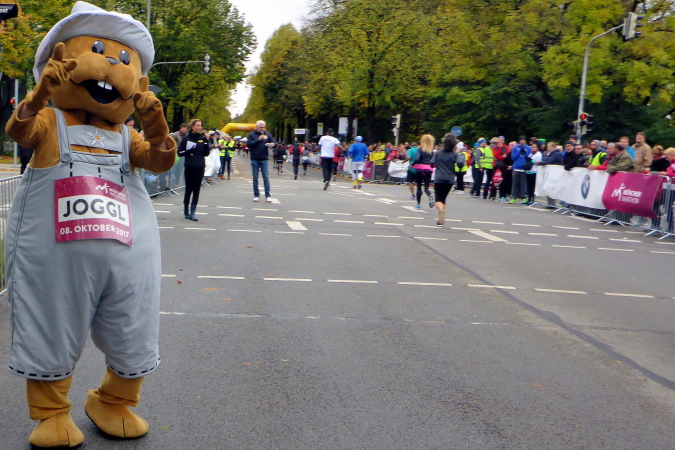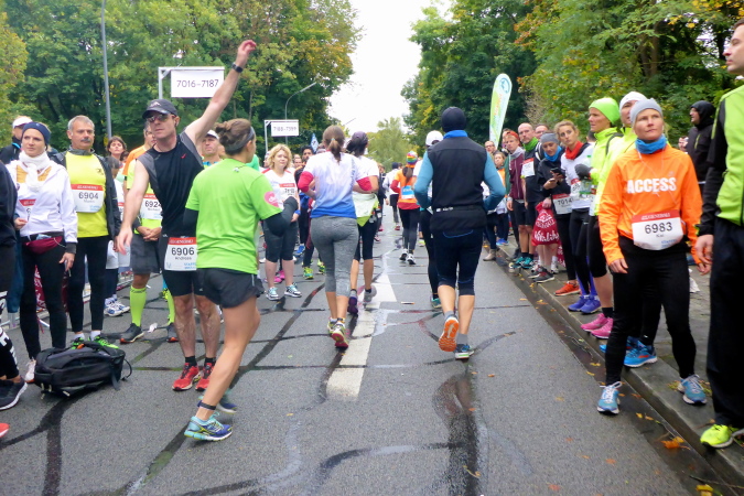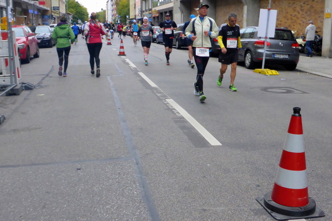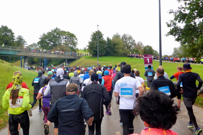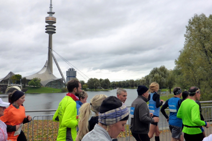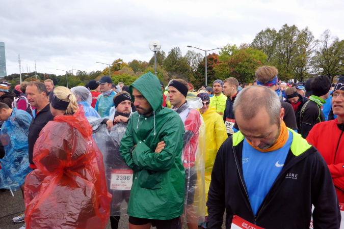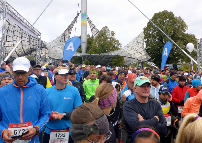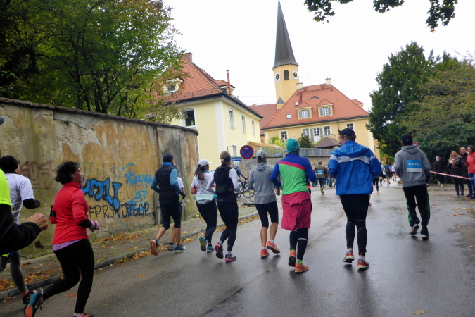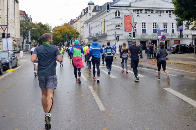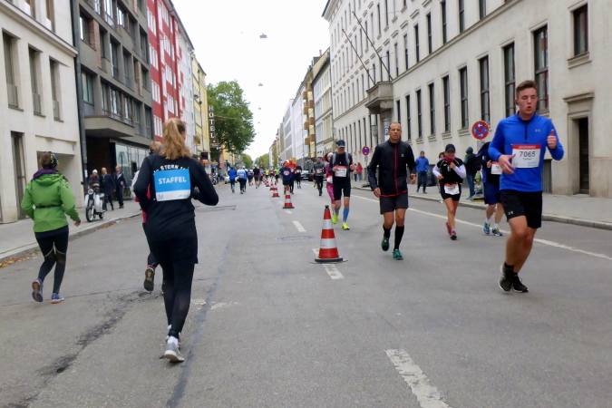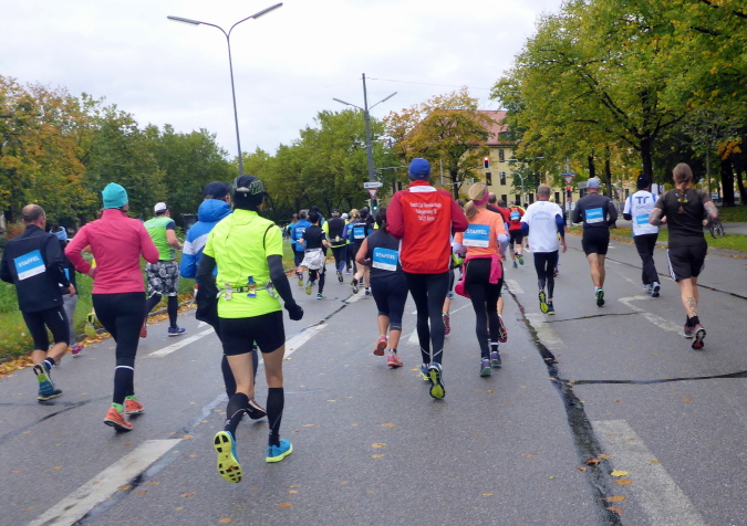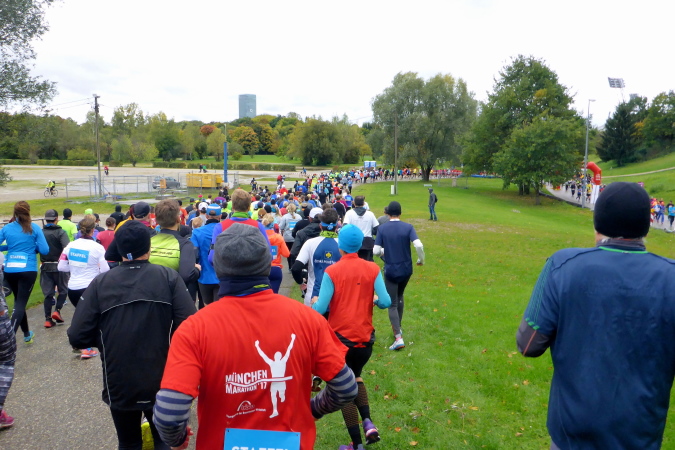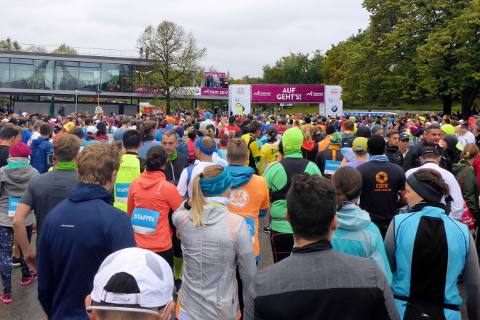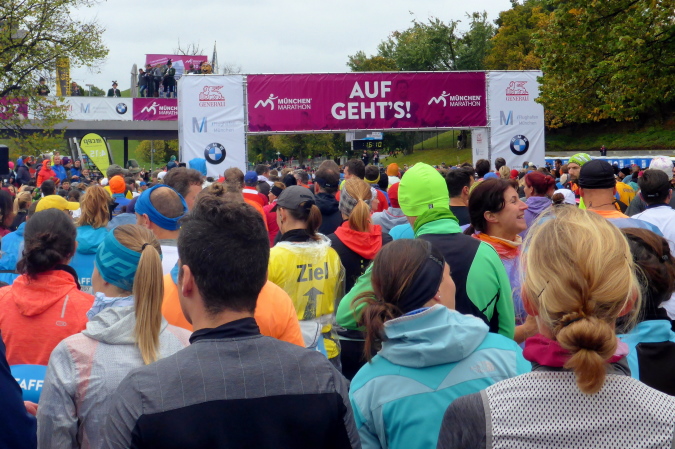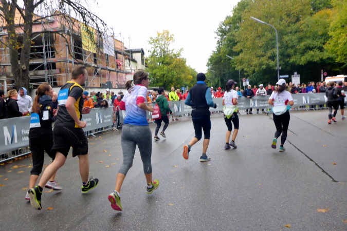 Pünktlich um zehn Uhr erfolgt der Startschuss durch eine Münchner Böllergruppe und die erste Startwelle mit den schnellen Läufern, die eine anvisierte Zeit von unter 3:15 Stunden geplant haben, geht auf die Reise. Insgesamt wird in fünf Wellen gestartet, ich selbst habe mich am Ende des dritten Startblocks einsortiert und fühle mich dort gut aufgehoben. Pacemaker sind ebenfalls reichlich vertreten. Für die Zeiten zwischen drei und fünf Stunden wird im Viertelstundentakt jeweils ein Pacemaker für eine pünktliche Zielankunft sorgen.