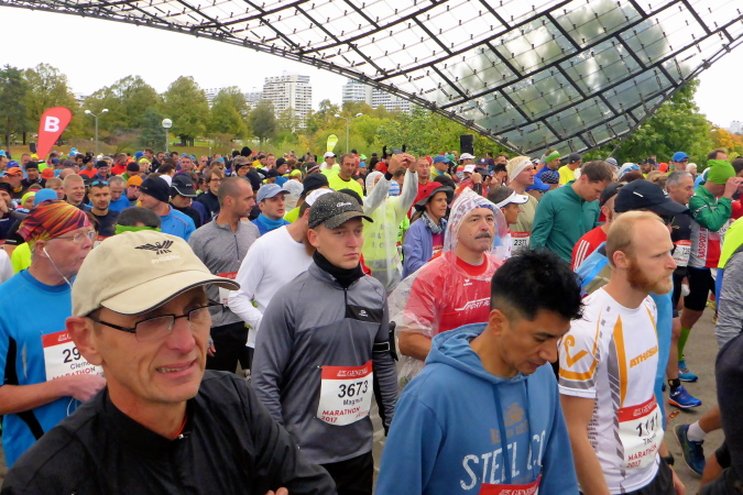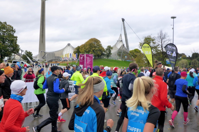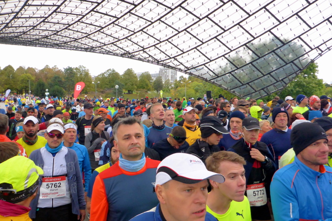 Um neun Uhr habe ich mit einigen Lauffreunden im Olympiastadion verabredet. Auch hier wird der Zutritt wieder nur mit der gültigen Startnummer gewährt. Wartezeiten gibt es aber nicht, ich bin pünktlich am Treffpunkt. Nach diversen Erinnerungsfotos gehen wir gemeinsam zum Coubertinplatz, wo um zehn Uhr der Start erfolgen sollte. Auch das war für mich neu, ich kannte noch den Start auf der breiten Ackermannstraße außerhalb des Olympiageländes. Der Coubertinplatz befindet sich zwischen Olympiahalle und -stadion, womit die Wege sehr kurz sind. Und dann halt das besondere Ambiente unter der berühmten Dachkonstruktion …