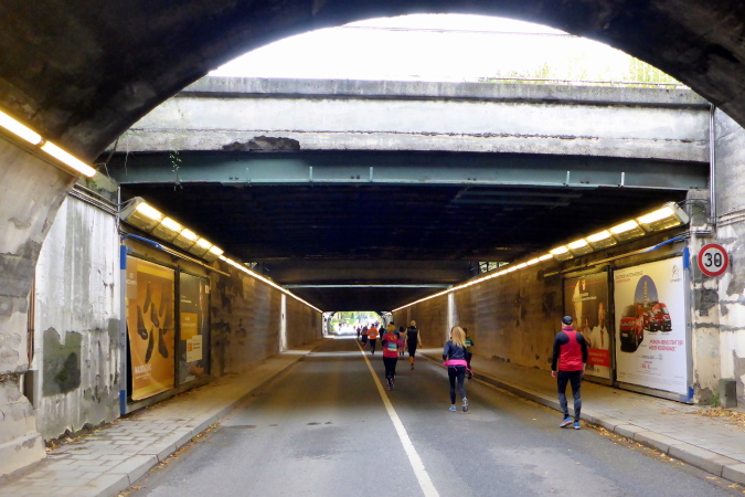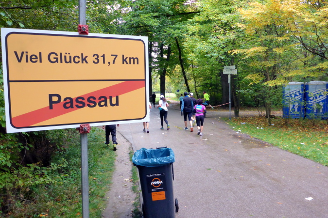 Für mich als begeisterten Landschaftsläufer sind die kommenden sieben Kilometer natürlich sehr willkommen. Von Kilometer 8 bis 15 kann ich hier die Ruhe und die gute Luft von Münchens „Grüner Lunge“ genießen. Der Englische Garten ist mit 375 Hektar eine der größten innerstädtischen Parkanlagen der Welt und auch bei Touristen äußerst beliebt. Der Chinesische Turm und der Monopteros zählen zu den beliebtesten Attraktionen. Diese bekommen wir heute nicht zu Gesicht, wir befinden uns nämlich im nördlichen Teil des Englischen Gartens, der sogenannten Hirschau. Diese Bezeichnung geht auf den früheren Wildreichtum in den Isarauen zurück. Bei Kilometer 10 erreichen wir eine der zahlreichen Verpflegungsstellen auf der Strecke. Sie wird wie jedes Jahr von einem Passauer Sportverein betrieben. Mit einem humorigen Ortsschild verabschieden sich die Passauer von den Läufern und verweisen auf die verbleibenden 31,7 Kilometer.