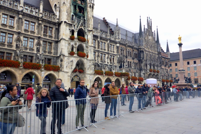 Etwa auf Höhe des Rathausdaches befindet sich das berühmte Glockenspiel, ein wahres Touristenmagnet in München. In dem Glockenspiel werden zwei Ereignisse aus der Münchner Stadtgeschichte dargestellt. Das ist zunächst die Hochzeit von Herzog Wilhelm V. mit Renate von Lothringen aus dem Jahre 1568, aus deren Anlass ein Ritterturnier auf dem Marienplatz stattfand. Bei dem Wettkampf triumphierte der bayerische Ritter über seinen lothringischen Gegner. 16 Figuren beleben diese Szene. In der darunterliegenden Etage tanzen die Schäffler (Fassmacher), die sich nach einer schweren Pestepidemie als Erste wieder auf die Straßen wagten und die Münchner Bevölkerung mit ihrem Tanz erfreuten. Der Tanz der Münchner Schäffler findet seitdem alle sieben Jahre statt. Das Glockenspiel, das von 43 Glocken akustisch unterstützt wird, kann man täglich um 11 und 12 Uhr bewundern, in den Sommermonaten zusätzlich nochmal um 17 Uhr.