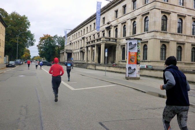 Vorbei am Odeon und Palais Leuchtenberg nähern wir uns dem Königsplatz. Erst mal geht es in die Maxvorstadt, wo wir eine weitere Schleife laufen. Teilweise haben wir hier Gegenverkehr und ich suche das vor mir liegende Feld nach bekannten Gesichtern ab. Andrea kann ich ausmachen, die mir freudig zuwinkt. Sie läuft heute mit schwerem Gepäck, um sich auf einen Etappenlauf vorzubereiten. Die Schleife haben wir bei Kilometer 36 hinter uns, wir nähern uns erneut dem Königsplatz.