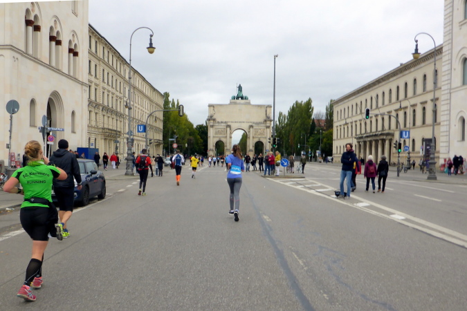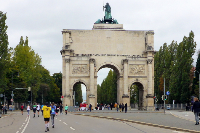 Wir umrunden nun das Propyläen und lassen damit einen weiteren Höhepunkt des München Marathons hinter uns. Vorbei am Lenbachhaus finden wir uns bald bei Kilometer 37 wieder und zurück auf der Ludwigstraße, einer der bedeutendsten Prachtstraßen Münchens. Die Bayerische Staatsbibliothek und die Pfarrkirche St. Ludwig prägen hier das Straßenbild. Vor ein paar Stunden hatte ich das Siegestor am Ende der Ludwigstraße ja schon mal gesehen, jetzt dürfen wir es auch endlich umlaufen. Wieder einmal war es Ludwig I., der den Auftrag für den Triumphbogen gab. Im zweiten Weltkrieg wurde das Siegestor schwer beschädigt und 1958 wieder aufgebaut. Seitdem trägt es auf der Rückseite den Schriftzug: Dem Sieg geweiht, vom Krieg zerstört, zum Frieden mahnend.