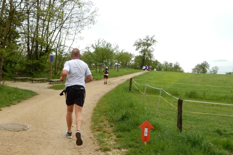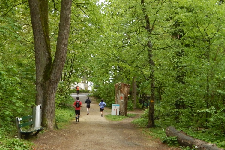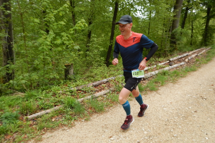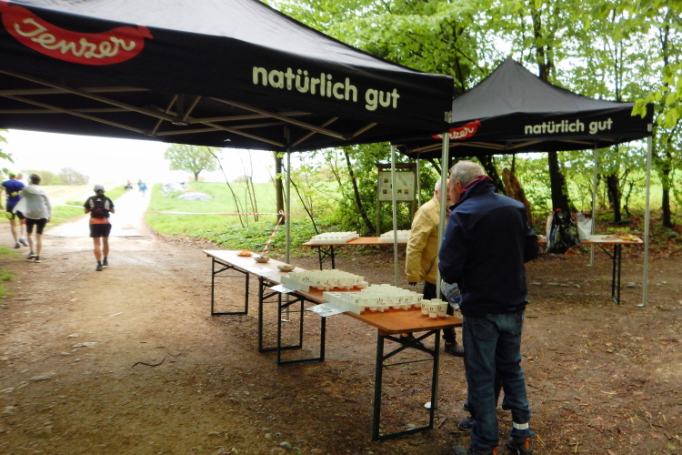 Ich habe nichts dagegen, dass Petrus dann doch noch ein Einsehen hat und ich nach der letzten Vollverpflegung beim Eglisgraben die verbleibenden sechs Kilometer ohne diese Dusche laufen kann. Die Luft wurde nämlich schon in der vergangenen Nacht von Pollen und Sahrarastaub gewaschen und ist neben dem saftigen Grün und der trotz Stadtnähe gegebenen Stille des Waldes eine gute Ingredienz dieses Laufs.
