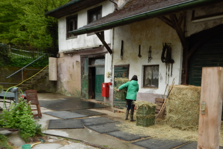 Nach einem kurzen Stück im Wald geht es nochmals an den Waldrand, entlang des südlichen Endes dieser Rodungsfläche, welche hier den Namen Gruetächer trägt: gerodeter Acker. Danach ist vorerst Schluss mit Kahlschlag. Die Eselhalle heißt so, weil man nur Esel auf diese steile, mit Obstbäumen durchsetzte Halde ließ. Die Pferde waren dafür zu schade. Mit den heute hier herumstaksenden Gestalten besteht keine Verbindung…