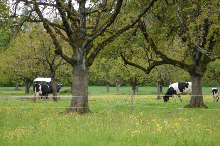 Später geht es wieder auf Wiesland einen steilen Pfad hoch, wo ich dem eine halbe Stunde nach uns gestarteten Führenden des Halbmarathons den Vortritt lasse, hinauf zur Schönmatt. Woher der Name kommt? Von der schönen Matte, die vor vierzig Jahren noch mein Haupt zierte? Oder daher, dass ich mich nach diesem Aufstieg schon ganz schön matt fühle? Oder vielleicht doch daher, dass schlichtweg kein anderes Attribut dieser ausgedehnten, lauschigen, mit vielen Obstbäumen durchsetzten Matte gerecht werden kann? Die erste solche urkundliche Erwähnung geht zurück ins Jahr 1356, dem Jahr des großen Erdbebens von Basel.