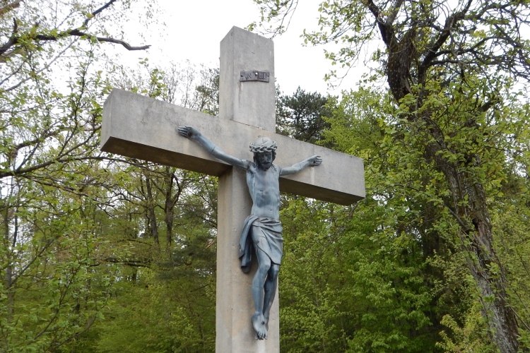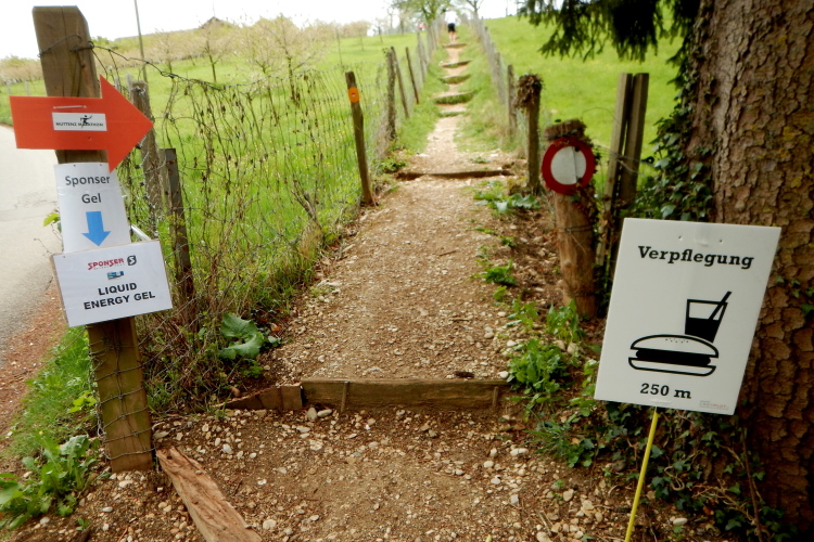 Schön ist die Aussicht auf den nächsten Verpflegungstisch nach einem Viertel der Strecke und für die ganz Schnellen war es die Aussicht, den Bergpreis holen zu können. Diesen hole ich mir bei den Läufern der der Kategorie Ü60 mit Schuhgröße US 10,5, oranger Kompaktkamera und Fehlsichtigkeit mit unterschiedlichen Dioptrien links und rechts, welche wissen, dass an dieser Stelle nicht nur die Gemeindegrenze, sondern gar die Kantonsgrenze überschritten wird. Beweis dafür sind die beiden, in ehemals katholisch geprägten Kantonen üblichen Wegkreuze.