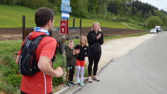 Federn lassen darf ich noch nicht, denn erst habe ich einen Sechstel der Strecke im Sack und auf den nächsten vier Kilometern sind 200 Höhenmeter zu überwinden. Zuvor kann ich nochmals etwas trinken, denn bei einer Wegkreuzung ist wieder ein Wasser-Doppelposten, um den ich vor allem auf dem Rückweg sicher froh sein werde.