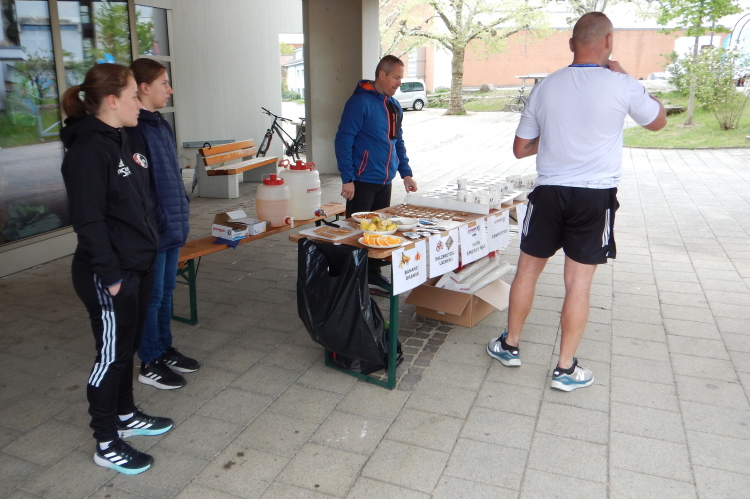 Auf diesem letzten Kilometer vor der Halbzeit habe ich von einem Moment auf den anderen wieder mit den in letzter Zeit leider wieder häufig auftretenden Darmbeschwerden zu kämpfen. Statt die Rampe hoch auf den Schulhof und auf die zweite Runde zu gehen, nehme ich die Rampe links, hinunter in die Katakomben. Nicht zum Pausentee wie jeweils die Fußballer… Den gibt es dann auf den ersten Metern der zweiten Hälfte mit salzigen, süßen und fruchtigen Beilagen. So sehr mich dies freut, so sehr irritiert mich das Fahrrad, welches auch plötzlich dort steht und unübersehbar als Besenfahrzeug für den Marathon gekennzeichnet ist.