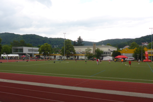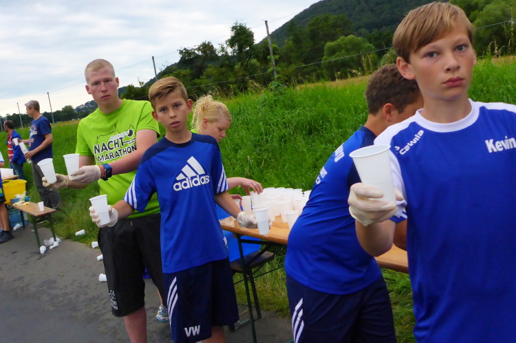 Unten auf den Lahnterrassen glühen zwei Einweggrills, zwei Nackensteaks, zwei Bratwürste, vier Speckspieße, neun Mädchen und ein glücklicher Junge. Glücklich ist auch Rene, der schon wieder ein Eis gefunden hat. Über den Hirsefeldsteg überqueren wir die Lahn. Dahinter ist der Staffelwechselpunkt und deshalb viel los.