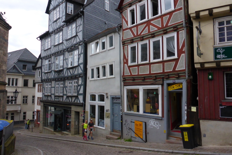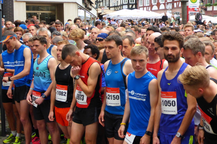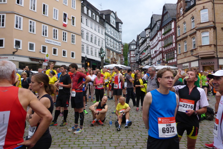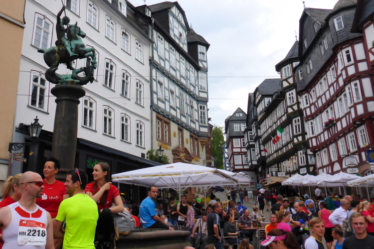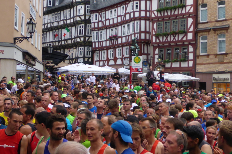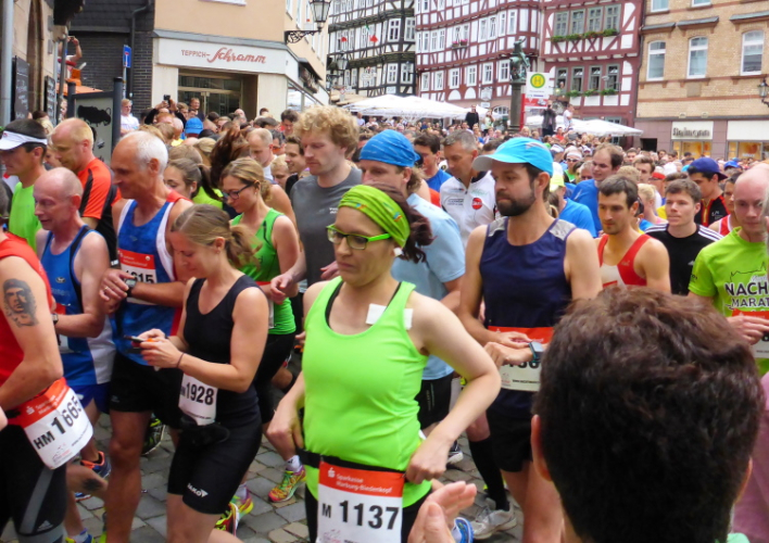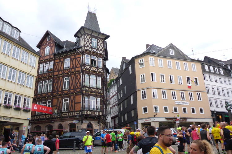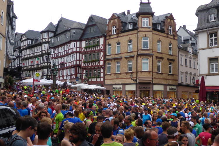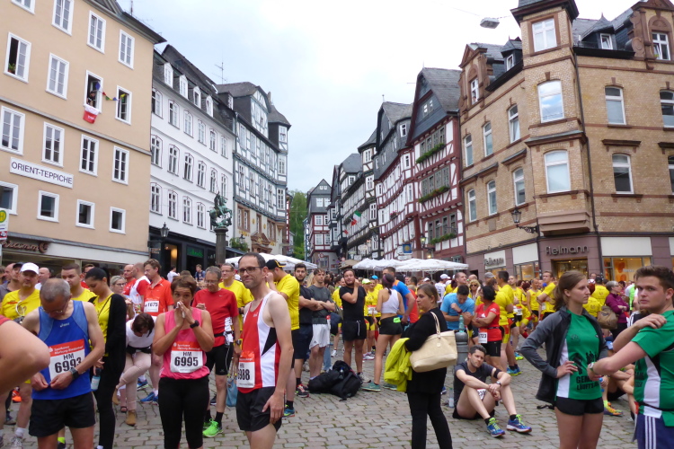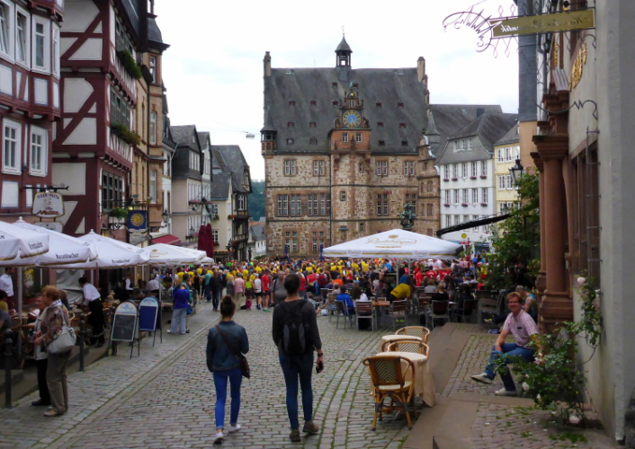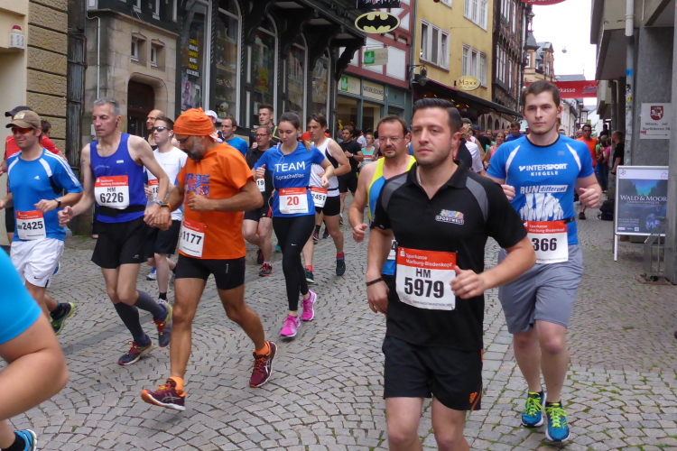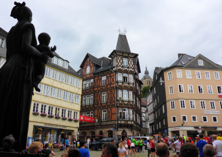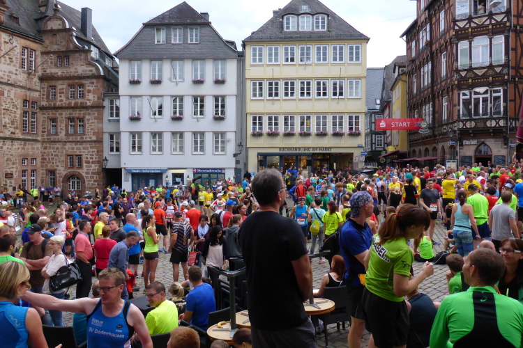 Es geht weiter die Mühltreppe hinauf zum Markplatz. Wieviele Läufer, Studenten und Professoren mögen sich schon diese Treppe hochgequält haben? Eine Gedenktafel erinnert an den „ordentlichen Professor“ Denis Papin. Es war 1690, als er die Dampfmaschine konstruierte.Was ein unordentlicher Professor konstruiert, weiss ich nicht, der Dampf von Papin jedenfalls steht schon auf dem Marktplatz, wo sich mehr als 2000 Läufer versammelt haben.