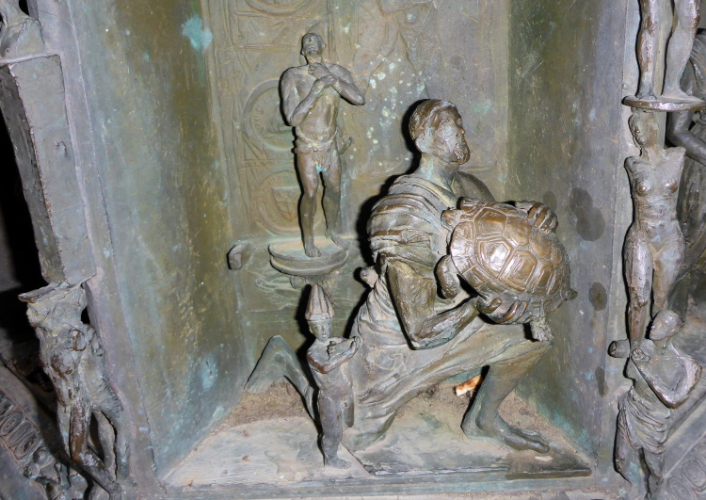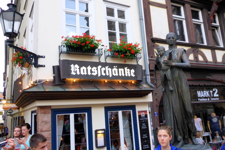 Ich ziehe also durch die Oberstadt auf der Suche nach einem Kochtopf, finde die Bronzestatue von „Christian, dem Kofferträger“ und etwas Besseres als Wasser. Rene auch - er hat ein Eis gefunden. Dr findet jede Eisdiele.