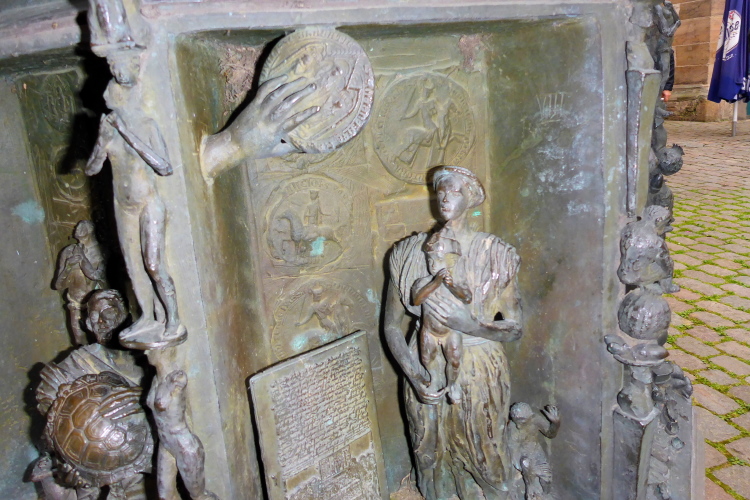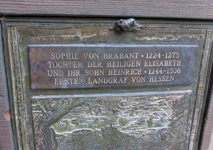 Links von der Mühltreppe ist die Statue der Sophie von Brabant, Tochter der Heiligen Elisabeth, uneheliche Tochter von Kaiser Friedrich II, König von Jerusalem. Laut Geschichtsbuch ist Sophie die Tochter von Ludwig IV, Landgraf von Thüringen. Sophie hält den vierjährigen Heinrich I (genannt „das Kind“, welch Wunder!) in den Händen, ruft ihn zum Landgrafen von Hessen aus. Das war 1247.
