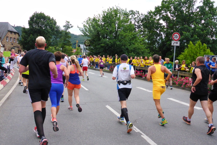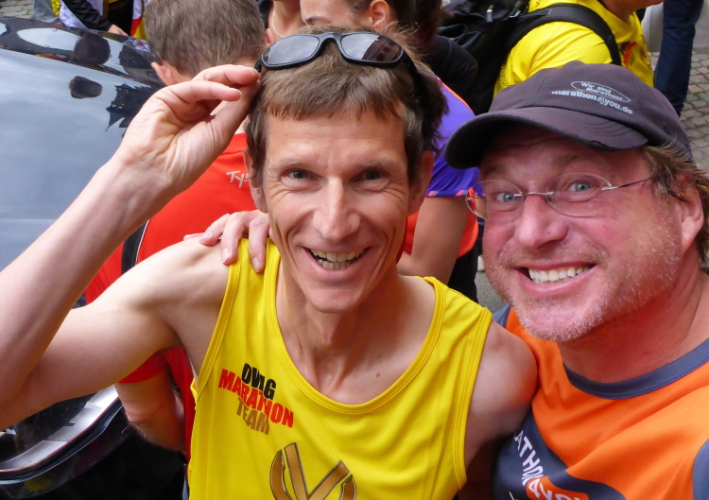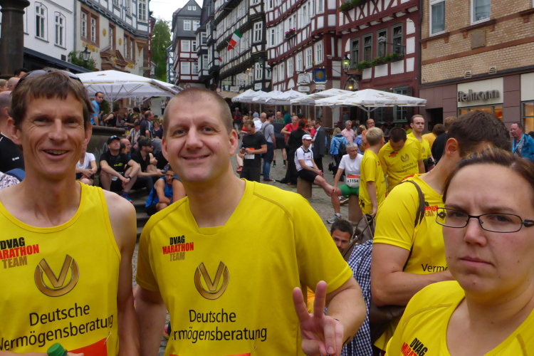 Apropos Diele, Marco Diehl, der Deutsche Meister klopft mir auf die Schulter: „ Joe, 80 Grad ist schon ne Leistung!“ Marco ist der Leader der Läufer der Deutschen Vermögensverwaltung, alle in auffallendem Gelb, alle für den Halbmarathon gemeldet. Es gibt 200mal mehr Halbmarathonläufer als Langsstreckler. Ein Beweis, wie gut die Aufbauarbeit des Ultra Sport Club Marburg ist.