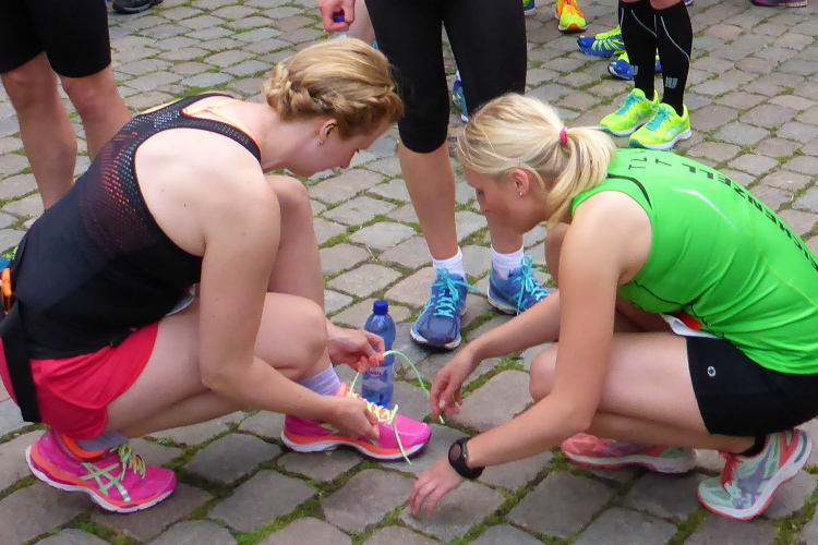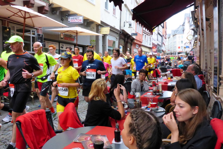Schnell wird der Weg hinabgelaufen. Darf jetzt nicht auf Läufer aufzulaufen, die sich von den Restaurantgästen entlang der Barfüssergasse noch schnell ein E.Coli-freies Getränk vom Tisch reißen. Ich lass mich gerne mitreißen. Martin fasst es in Worte: „ Es gibt hier mehr zu sehen, als bei einem Ultralauf“. Das Sehenswerte erwische ich fotomäßig aber nur, wenn es vorbeizieht. Dann wippen die blonden Haare schnell außer Reichweite. Es folgen zwar welche nach, aber die haben dann die Gewichtsklasse von Martin.