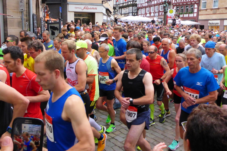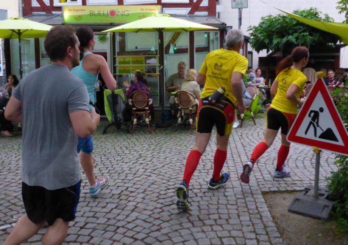 Um 19 Uhr ertönt das „Dong Tata“ vom Rathausgockel und los geht’s. Ich habe Zeit genug, um mich von meinem Fotoposten vor der ersten Reihe zurück auf den Marktplatz zu begeben, um dann über die beiden Zeitmessmatten zu laufen. Der Chip ist in der Startnummer integriert, der muss auf der ersten Matte aufgeweckt werden, damit die zweite Matte Bescheid weiß.