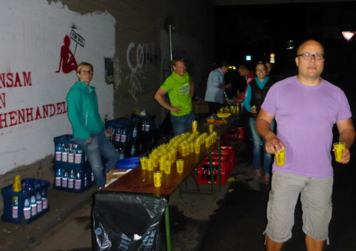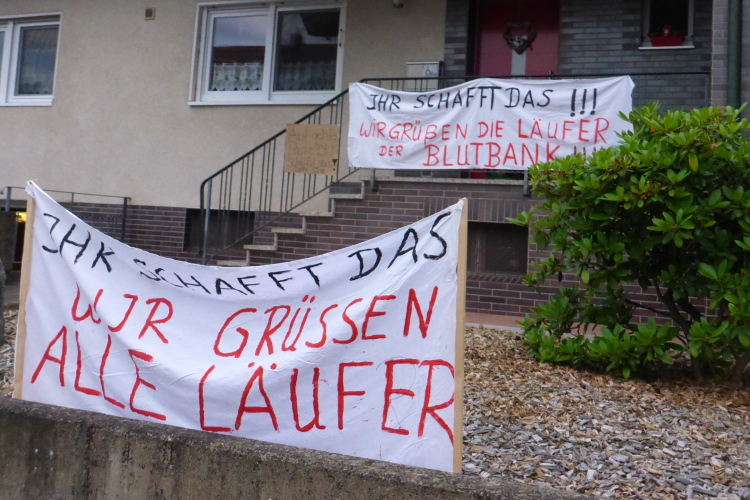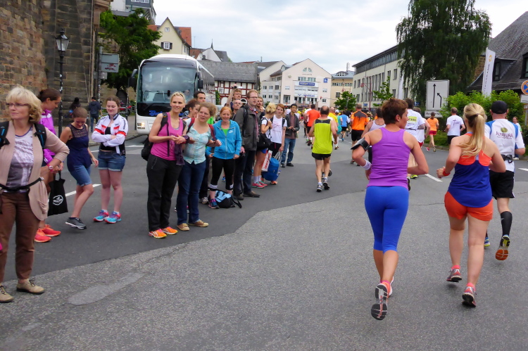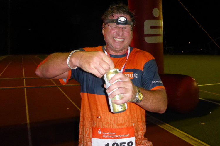 Dann lerne ich Sivabalan Pandian aus Mumbai kennen, der seit drei Jahren nur noch abgekochtes Wasser trinkt und so 70 kg abgenommen hat. Ein Sixpack hatte er pro Tag getrunken. Ich frage „What?“ Er sagt: „Whiskey!“ Heute ist sein 48. Marathon und der 22. in Deutschland. Letzte Woche ist er 4 Marathons in Amerika gelaufen. Mich beeindruckt seine Lebensfreude. Er ist heute Morgen in Frankfurt gelandet und will am Sonntag „somewhere near Kiel“ einen Marathon laufen. Ich glaube, nur bei Marathons trifft man so durchgeknallte Typen. Und an den Verpflegungsstationen in Gisselberg.