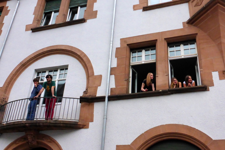 Nachdem wir den Rudolfsplatz unterquert haben, gelangen wir zur alten Universitätskirche aus dem 13. Jahrhundert. Hinter der Kirche war das Dominikanerkloster. Aus dem Kloster machte man die Universität. Da geh ich jetzt mal rein. Im Kreuzgang gibt es noch die 800 Jahre alten, bunten Zellenfenster der Mönche. Durch die gibt es einen schönen Blick auf die Fachwerkhäuser.