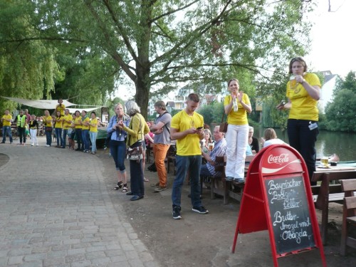 Auch das knapp 1.000 Seelendorf Gisselberg gehört zu Marburg. Traditionell gibt es hier für die Läufer ein üppiges Buffet. Es gibt alles, außer Bier. Das bekommt erst auf der zweiten Runde. Tradition hat auch die „Blutbank“-Gruppe, die uns kurz danach mit La-Ola feiert.