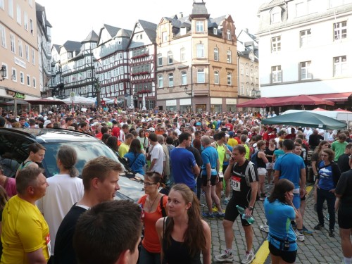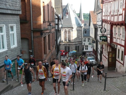 Wir sind auf dem Marktplatz in der Oberstadt nicht nur von vielen Läufern, sondern auch von vielen historischen Gebäuden umgeben. Die Oberstadt ist ein Shopping- und Genuss-Paradies und man sagt, dass Marburg 1.000 Kneipen hat, die nicht nur von den weit über 20.000 Studenten aus aller Herren Länder gerne besucht werden.
