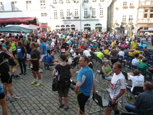 Der Gockel kräht vom Rathaus, was jedoch nicht das Startsignal ist. Zunächst hat Arthur Schmidt noch Oberbürgermeister Georg Vaupel am Mikrofon. Auch ich darf ein paar Worte sagen, dann gibt es noch etwas Werbung für Marathon4you (danke!) und los geht‘s. Von rekordverdächtigen 2076 gemeldeten Läuferinnen und Läufern sind ungefähr 1.600 am Start - rätselhafter „Schwund“.