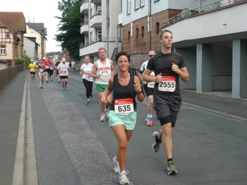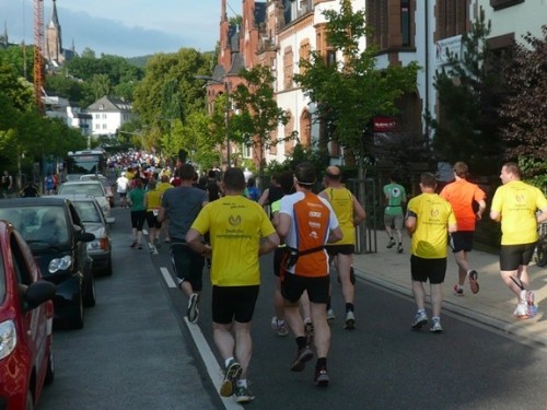 Am Ende der Straße sind wir auf Lahnebene und laufen in einer Spitzkehre unterhalb der Oberstadt zur Alten Universität neben der Lahn. Das Feld hat sich jetzt gut auseinander gezogen. Wir sind auf der Nordschleife, die nur einmal zu durchlaufen ist.