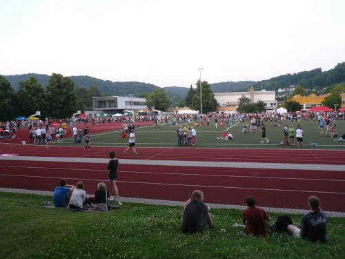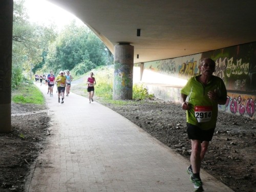 Die Südspange der B255 wird „unterlaufen“ und wir folgen weiter dem Lahnradweg, der jetzt parallel der B3 verläuft. Camping- und Minigolfplatz und das Aquamar Sport- und Freizeitbad liegen an der Strecke. Am Ende des Bades beginnt das Universitätsstadion. Schon von weitem ist die Stimme von Arthur Schmidt zu hören, der die Halbmarathonteilnehmer im Stadion begrüßt. Wie schon gesagt, der Moderator ist in Läuferkreisen äußerst beliebt. Was aber nur wenige wissen: In seinem „zweiten“ Leben betreut er 74 Strafgefangene der JVA Gießen im offenen Vollzug.